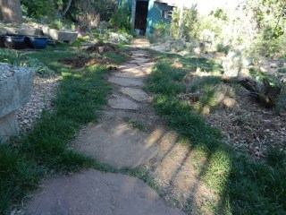 The completed path. All that’s left is to “puddle in” some of the soil around the flagstones so that they don’t wobble.
