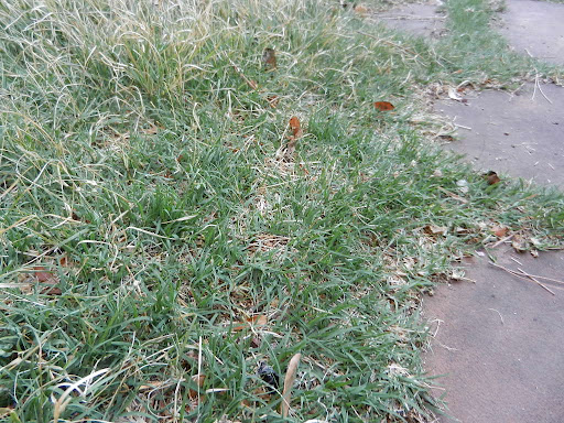 Here’s a shot of, I think, ‘Sharp’s Improved’ buffalo grass growing in the side yard, taken this morning, too. If you ask me, this is the right color for turf in Colorado.