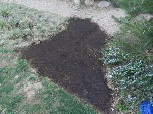 This is a small patch, say three feet by five feet, of a new sowing of blue grama seed, covered with some cow and compost I picked up at the local garden center (by the bag), with a little binder mixed in.