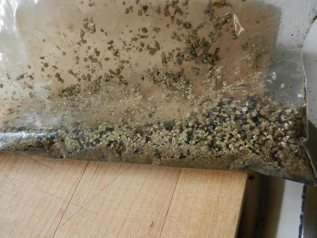 It’s at this point, unfortunately, where I have to be the most focused, because those little things (I guess they’re coleoptiles) are very, very fragile. I get some seed pots ready (filled with a mix of peat moss, perlite, and sand), make sure the mix is completely wet, tamped down (not level with the top of the pot), then fill the baggie with a little water and gently pour the vermiculite with the seeds onto the top of the pot, label it, and sprinkle a little sand on top of the pot.