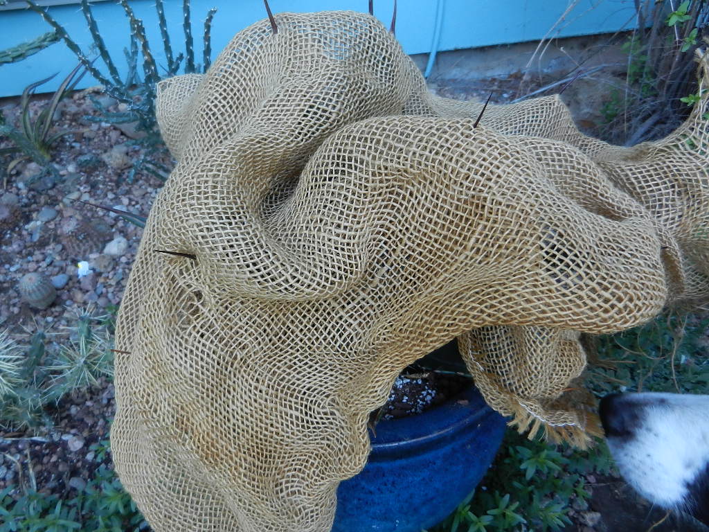 And since it was going into the intense sunlight at this elevation, with a third more ultraviolet than at sea level, it needed a little protection from the sun for its first week or so outside. (I don’t know how long that takes; usually it takes one day longer than you think.) Even agaves, yuccas, etc., that come from nurseries in Tucson and Phoenix will fry in Denver’s sun if they don’t get time to adjust to it. I usually just spray the plants with CloudCover (seems to work), and plant them, or build a little tent out of shade cloth and bamboo stakes, but this time I thought burlap would be a good idea.