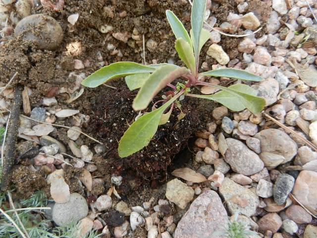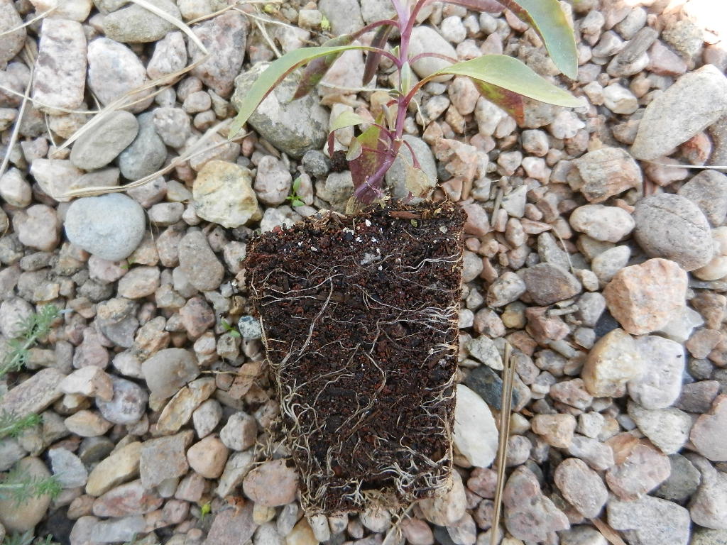 Nice root system on this one. (Penstemon incertus from Agua Fria Nursery.) If the roots were coiled at the base, I would gently tease them apart with a fork (eating-type, remembering to wash it before eating with it, I guess) or a toothpick.