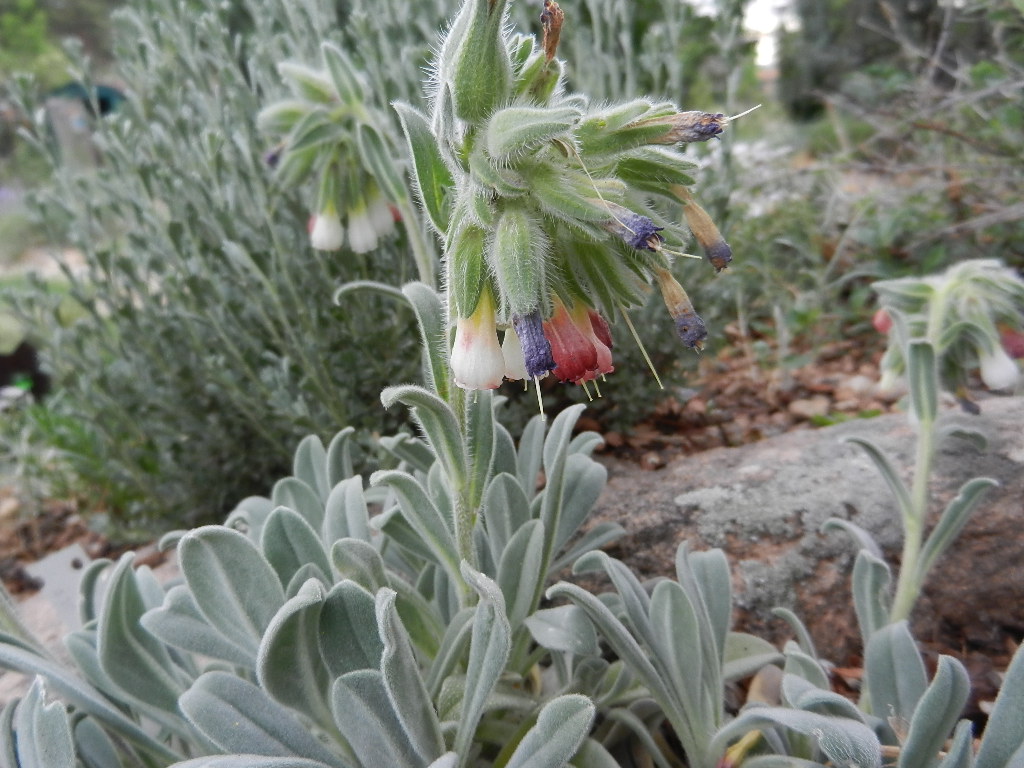 I noticed one of new plants in bloom today: Onosma caerulescens. It isn’t quite the same as the brunfelsia, but the flowers open cream-colored, fade to red, then to purple as the calyces dry up. My version of yesterday, today, and tomorrow.