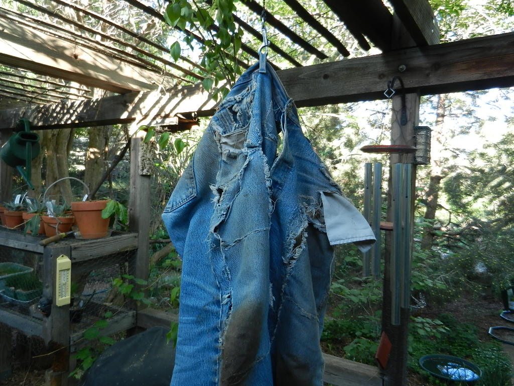 Oh, anyway, both my wife and I had the habit of wearing clothes until they barely hung together (a lot more attractive on a woman, if you ask me), and I took it to the extreme of patching my old pair of jeans until that last big rip that made them unwearable. Yes, I would use a pair of scissors to cut the patches, and since I learned to sew years ago, would continually be patching up my jeans. Patches on patches. Sometimes a little duct tape helped, too. There really is nothing like old, soft denim, especially if the pants have been worn so much that they kind of hang rather than fit, and a belt is obligatory. I wear pants like this in the garden every day. (I was going in this direction, really.)