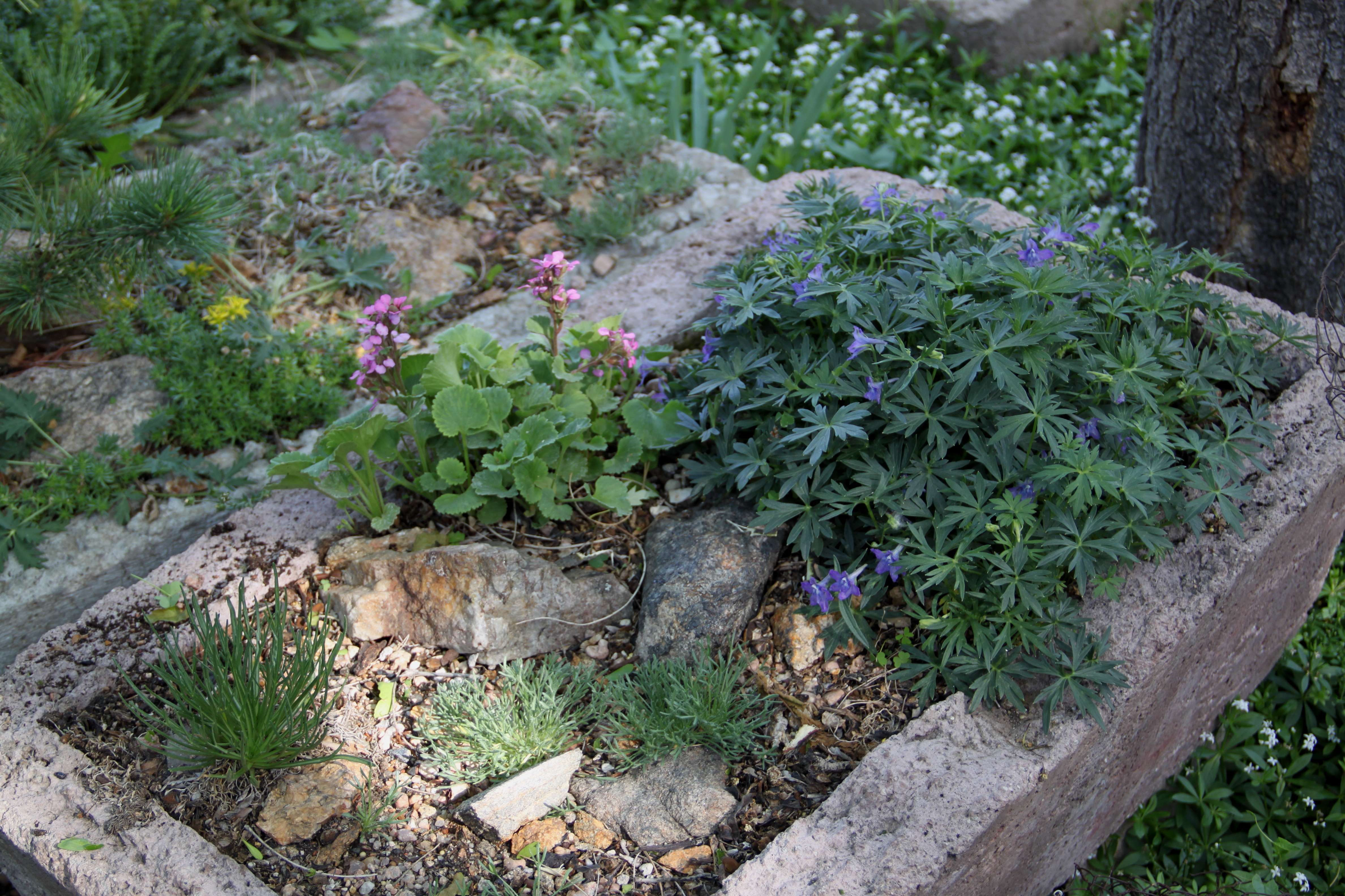 Here’s a trough, colored pink because I thought it would be artistic to try to mimic the color of the garden soil here (pink like Red Rocks just a few miles to the west), with Telesonix jamesii and Delphinium alpestre.