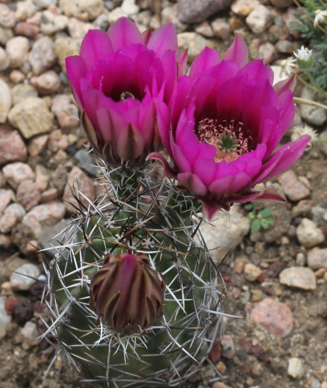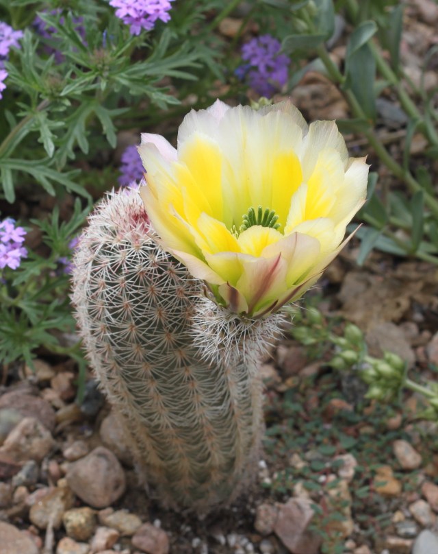 This first one has the biggest flower I’ve ever seen on a hardy cactus. This is a seed-grown hybrid whose parents are unknown. Maybe Echinocereus reichenbachii and something else echinocereus. I think that’s Verbena wrightii in the background. It’s a verbena, anyway.
