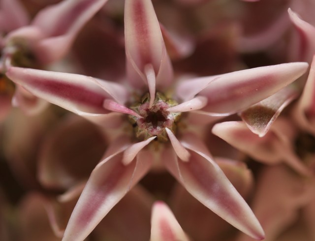 Anyway, it gave me an excuse to race outside, cut this flower and bring it inside to photograph it. I know, it looks like something waiting for you at the bottom of a pit in a science fiction movie. It’s the flower of the showy milkweed, Asclepias speciosa.