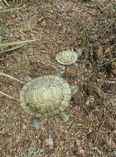 Some garden art will add class to this little corner. The turtles’ heads and legs flap in the breeze. Elegant, and tasteful.