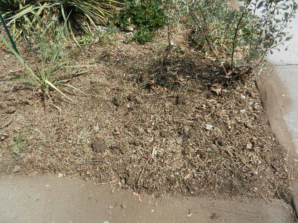 I removed the self-sown rabbitbrush that scraped the side of the car when I backed out of the driveway, swept up all the branches, leaves, cigarette butts, plastic wrappers, dog poop, and other nice stuff that had accumulated on this corner, and now I have an empty space.
