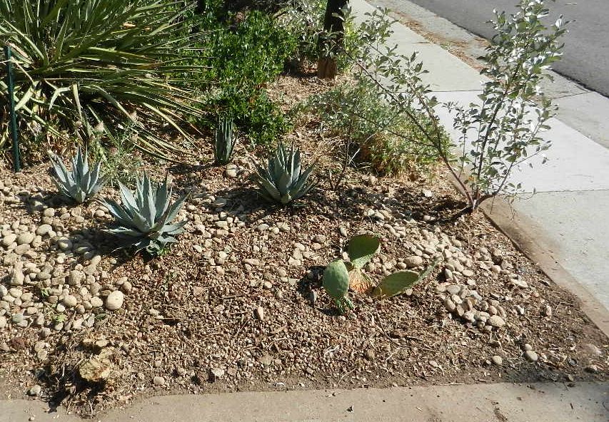 The formerly prostrate opuntia is now woozily adjusting to life as an upright plant, and I added an Agave palmeri in back, because, like any truly sophisticated gardener, I happened to have an extra one.