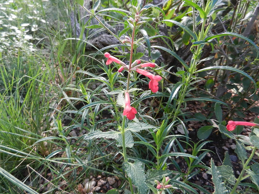 Stachys coccinea. Just started blooming here. It’s not even reliably hardy, though two plants made it through last winter with no problem (granted, they were under snow for what seemed like five years); it’s an incredible water hog (getting water this year as spillover from the newly seeded lawn….getting rain too, in the last couple of days); and, to tell the truth, I think it’s a fairly unattractive plant, what with those minty-green leaves and fake-looking red flowers (Stachys albotomentosa is much more attractive and even less hardy), but hummingbirds love it.