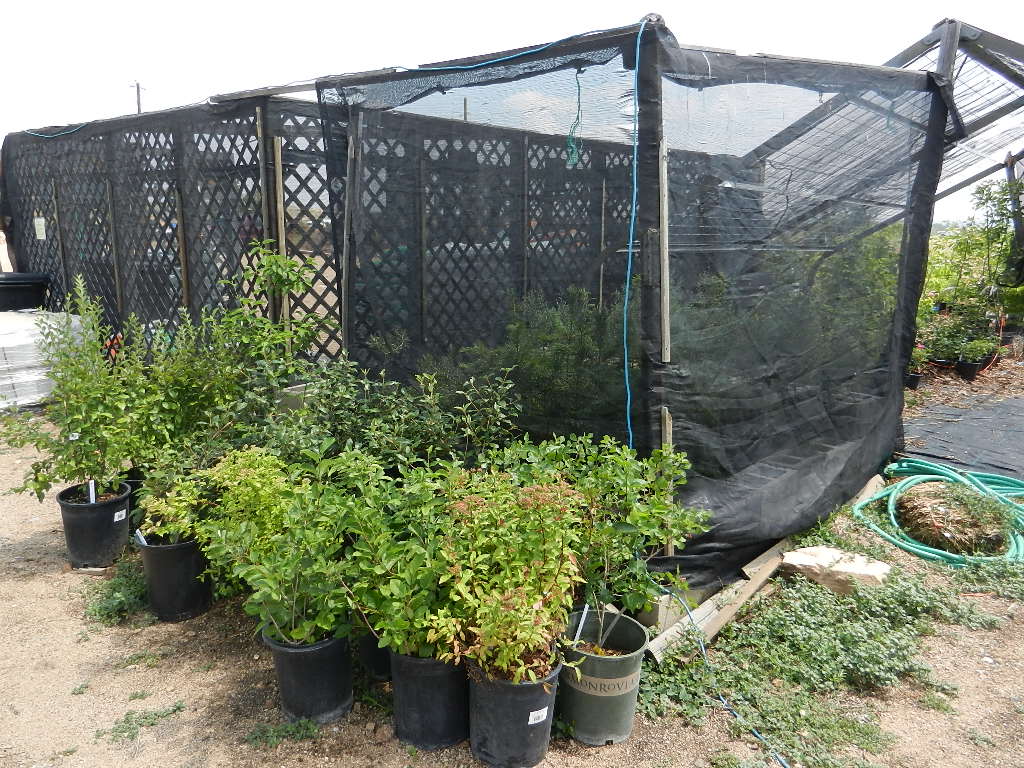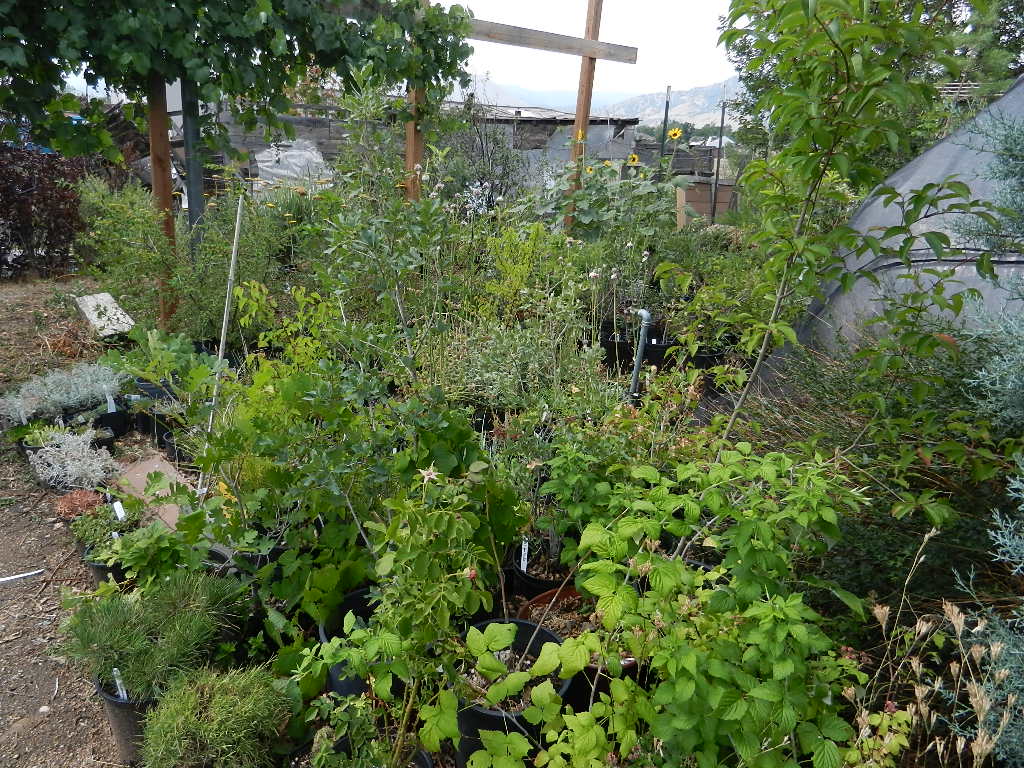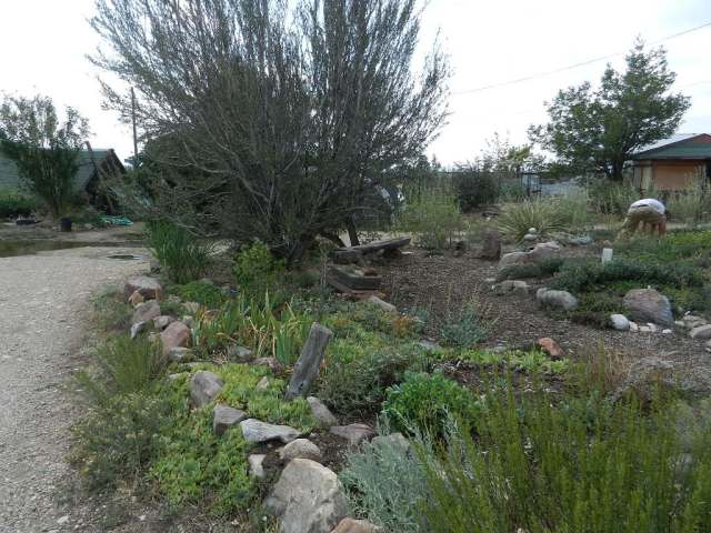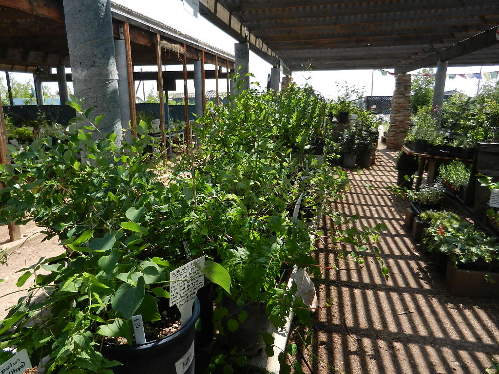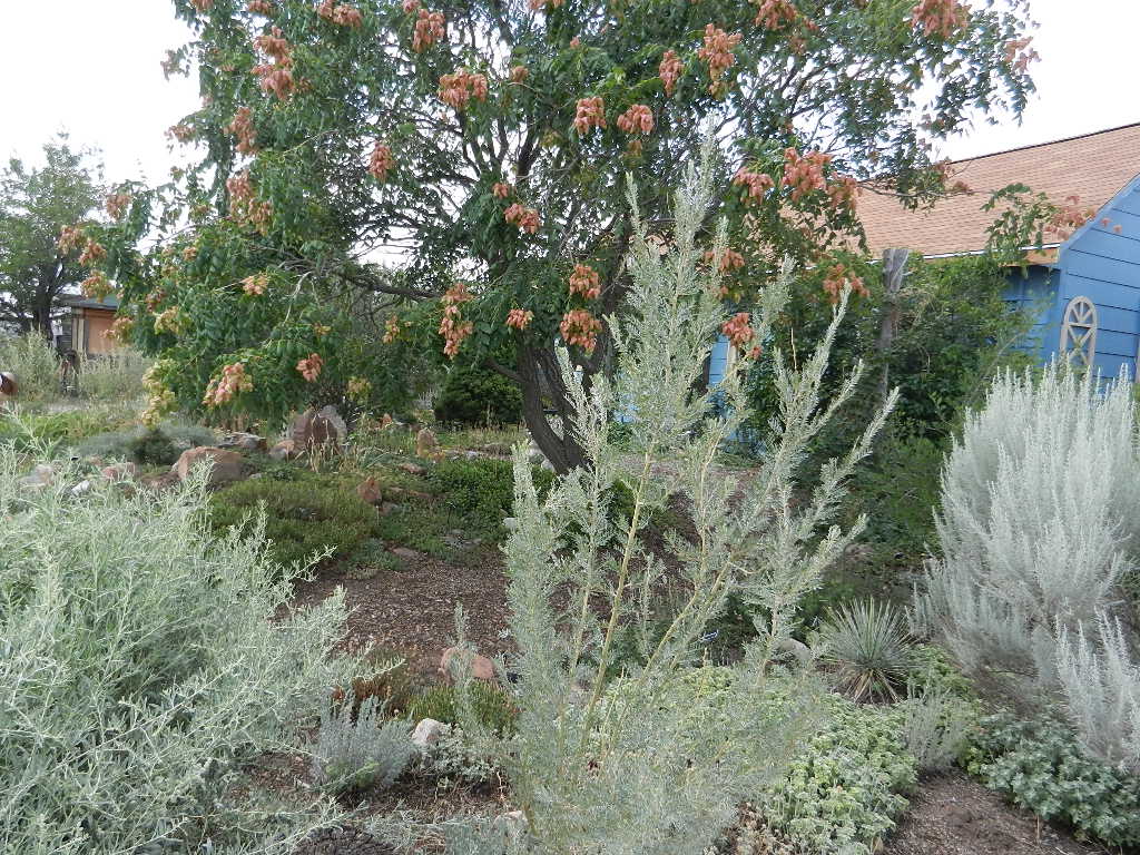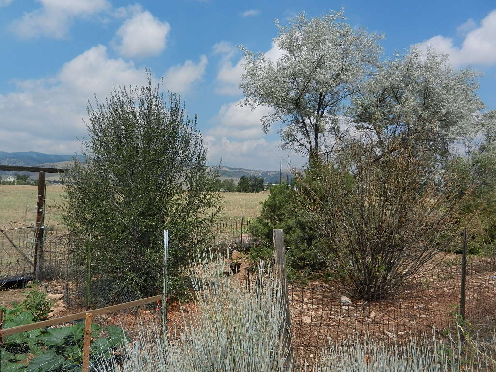 The unirrigated, windswept garden on the west side. The pea shrub, Caragana arborescens, has dropped its leaves in response to drought. They do that here, too, but so far not this year.