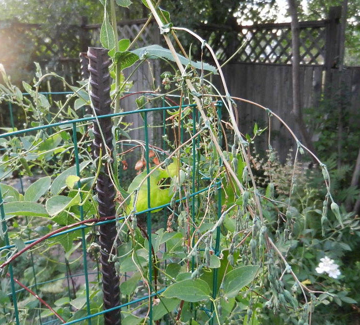 In other news, while I was well aware that the handsome cage of rebar and rabbit wire I made for a clematis was supporting a healthy growth of bindweed (keeps the sun off the clematis on hot days), I was completely unaware that a plant of prickly lettuce was growing in the cage, flowering at about five feet tall.