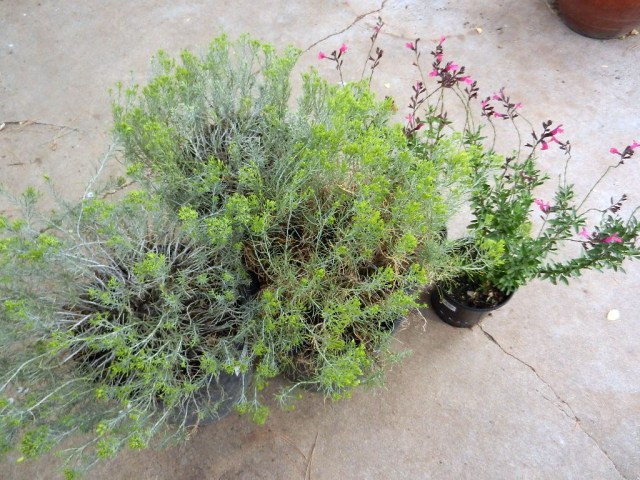 Also in the picture are a couple of Salvia greggii ‘Wild Thing’. The name says absolutely nothing about the plant, unlike ‘Furman’s Red’ which at least gives an indication of what color to expect. The latter overwinters for me fairly reliably but does not flower spectacularly without some serious rain in August or September.