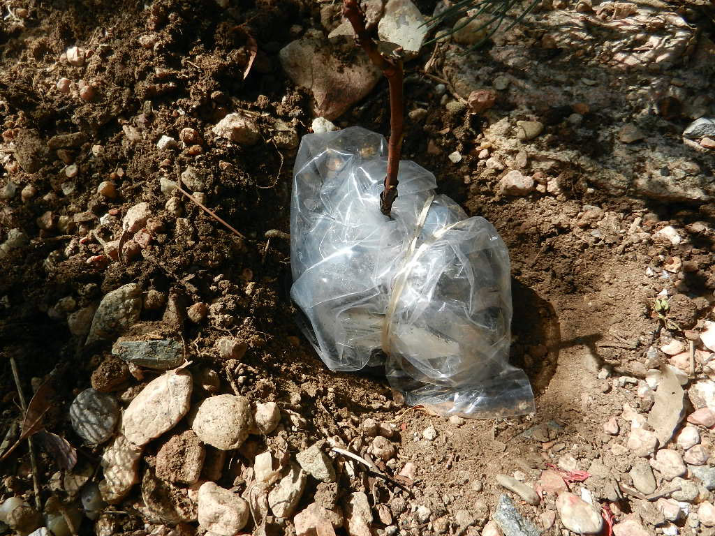 Checking for proper depth. Removing the plastic and rubber band before actual planting is a good idea.