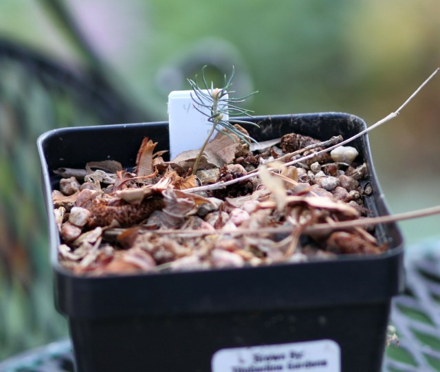 I’d never grown any conifers from seed before; though I’d planted the seed, nothing germinated, so I have to report being the proud owner of two tiny seedlings of Pinus monophylla. At least I hope that’s what they are. Though one of them came up in a pot labeled Townsendia, the other came up in a pot with the correct label and it would be too coincidental if these were seeds of any other conifer. I wrote about this pine back on August 4, and now I have two more. They can spend the winter outside in their pots, plunged into soil in the little nursery out in back, with a cage to keep rodents from looking at them too closely.