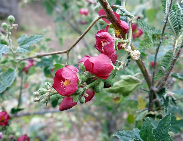 Sphaeralcea ‘Desert Sunset’ is looking particularly gorgeous right now; at least, the stems that weren’t knocked flat by the wind have some nice flowers on them. The name is odd; the plant looks like Sphaeralcea fendleri (I said something about this a while back, I think), which is a species of pine forests, not deserts. Whatever.