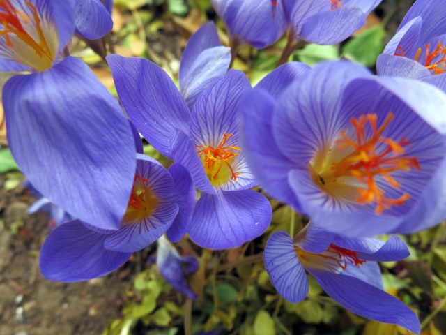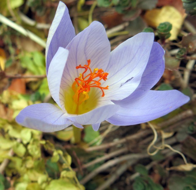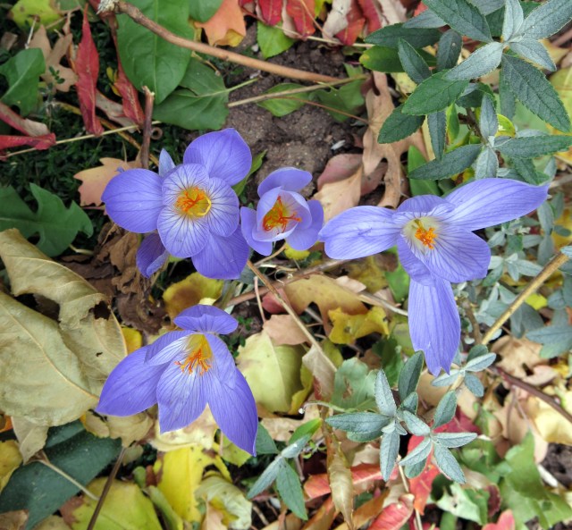Then, the crocuses. Crocus speciosus is pretty much everywhere here. Many were planted, but more have seeded themselves. Ants do the work, as usual. The seed pods of crocus are formed underground, and ants are attracted to the sticky-sweet coating on the seeds (the elaiosome) and carry them off.