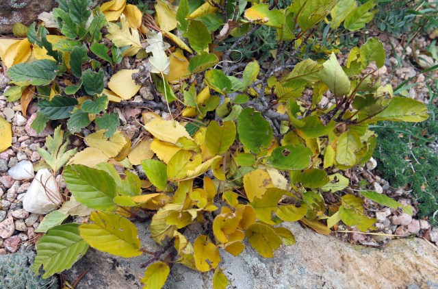 Last and, in a way, least, the world’s smallest, slowest-growing buckthorn, which might be Rhamnus pumila, in all its autumn glory. The plant is almost 20 years old and grows half an inch every year.