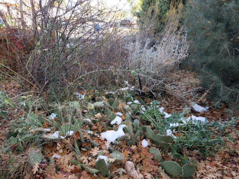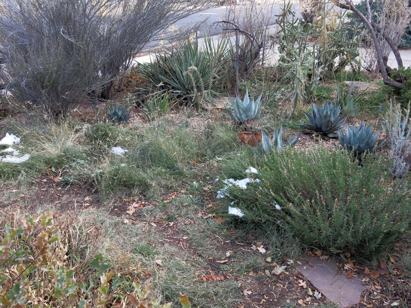 This is my front yard. It gets no water at all. None. Last year, the front yard endured less than seven-tenths of an inch of precipitation from the middle of July until the end of the year. There are no applications of fertilizer, no soil amendments, no spraying of anything. There is no design. No color harmonies. No consideration given to how large something might get. Plants that can’t tolerate this are allowed to die.