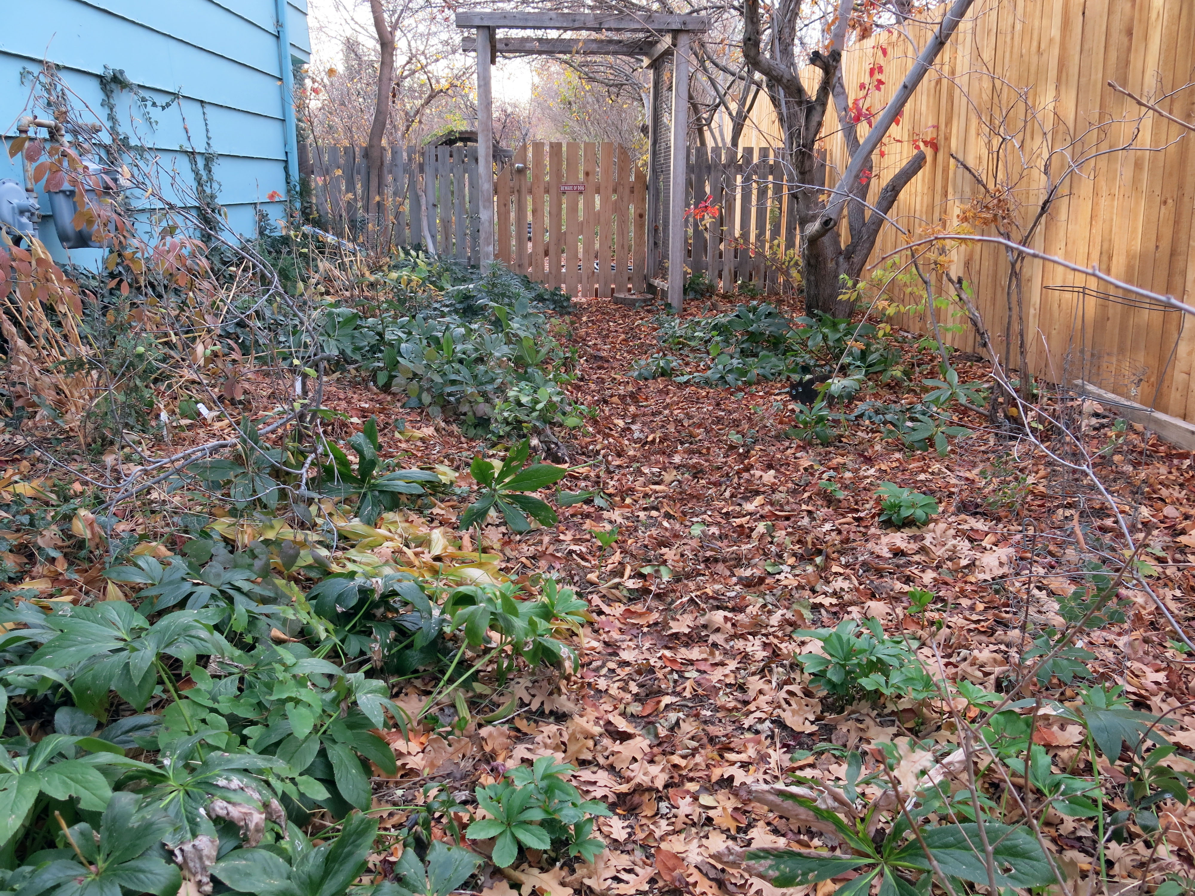 It’s looked the same for about ten years (an unusual phenomenon here), and has started to recover from the trampling it got when the fence was put up earlier this year. The plants are mostly hellebores, lily of the valley, cyclamen, snowdrops, Anemone nemorosa, erythroniums, epimediums, and a few other things. It doesn’t need very much water during the summer.