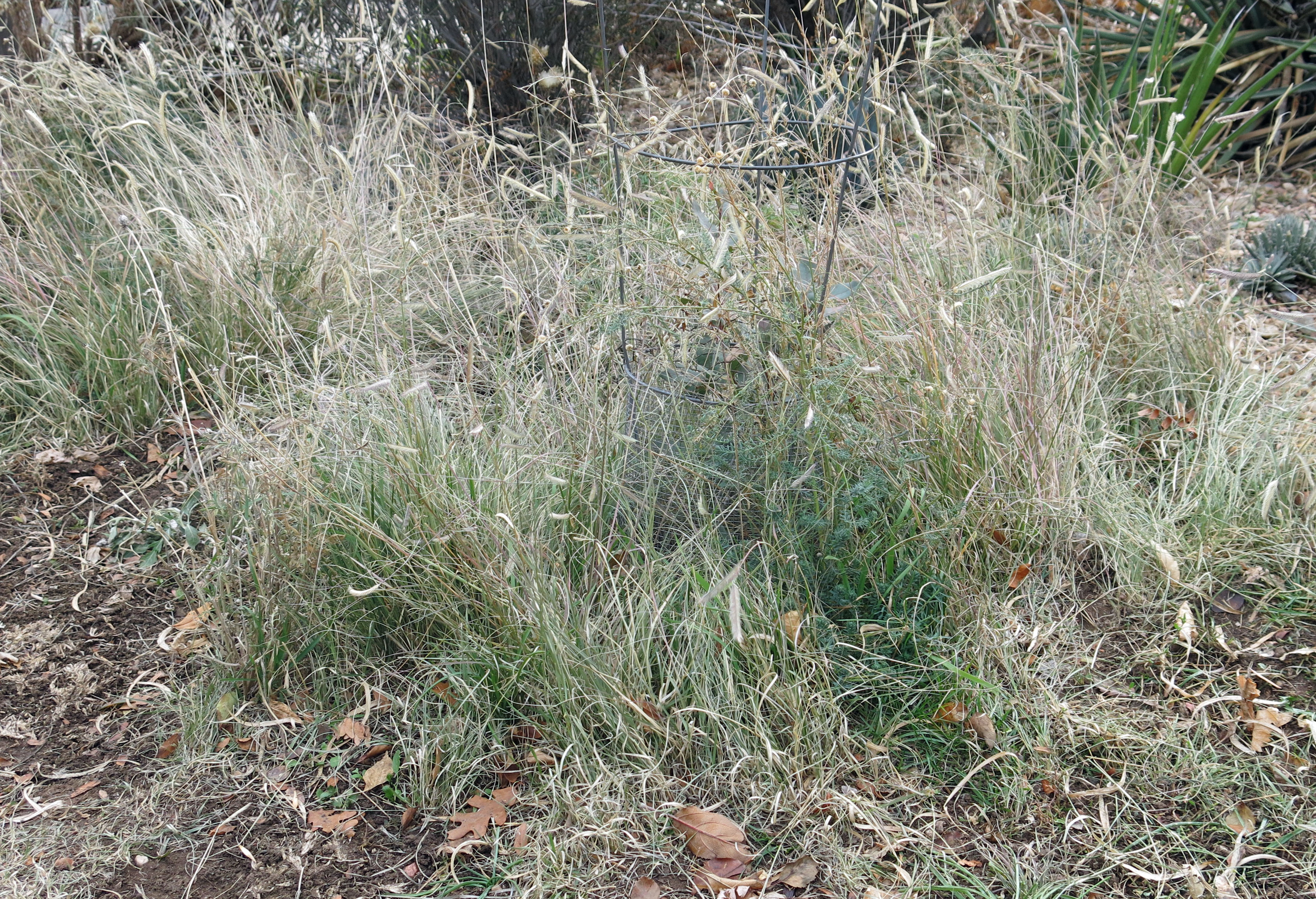 The world’s smallest front lawn, with Mexican blue oak in the cage. The lawn never gets mowed. Some of the neighbors think this is a disgrace, and an affront to everything that’s sacred in this country.