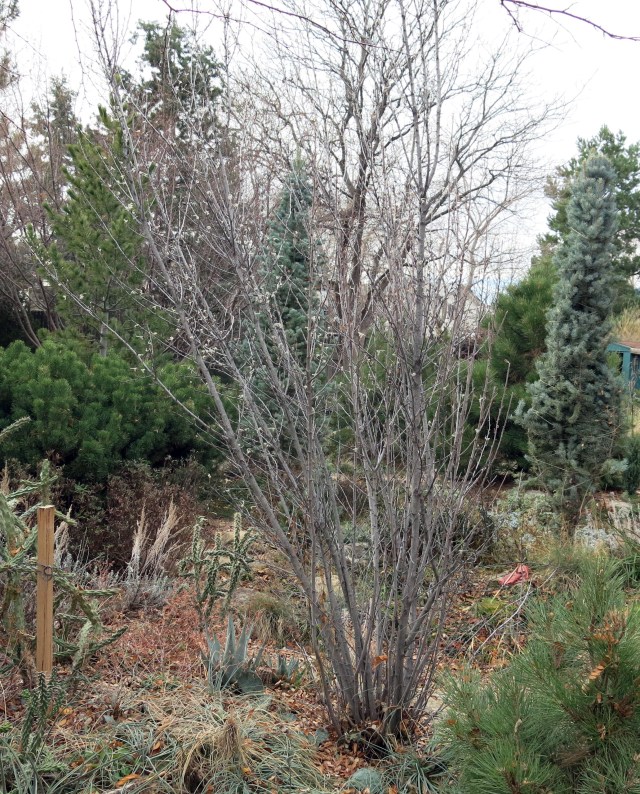 I like cercocarps. A lot. Cercocarpus montanus is one of my favorites, even though it’s common as dirt on the hogbacks a few miles west of here. Nice silver gray bark in winter. This one is about 20 years old; I like it so much, especially the way it takes to being pruned in an upright form, that I planted six more when a space in the garden miraculously opened up.