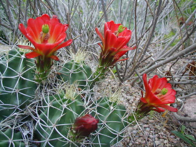 This last one is what Anderson, in The Cactus Family, calls Echinocereus mojavensis. The curved spines being diagnostic. Cindy wanted to draw this, so I dug up the whole plant and potted it, and it spent about a year in the house, sitting for its portrait. Then I replanted it in the garden. Maybe I should dig up all the plants and put them inside for the winter.