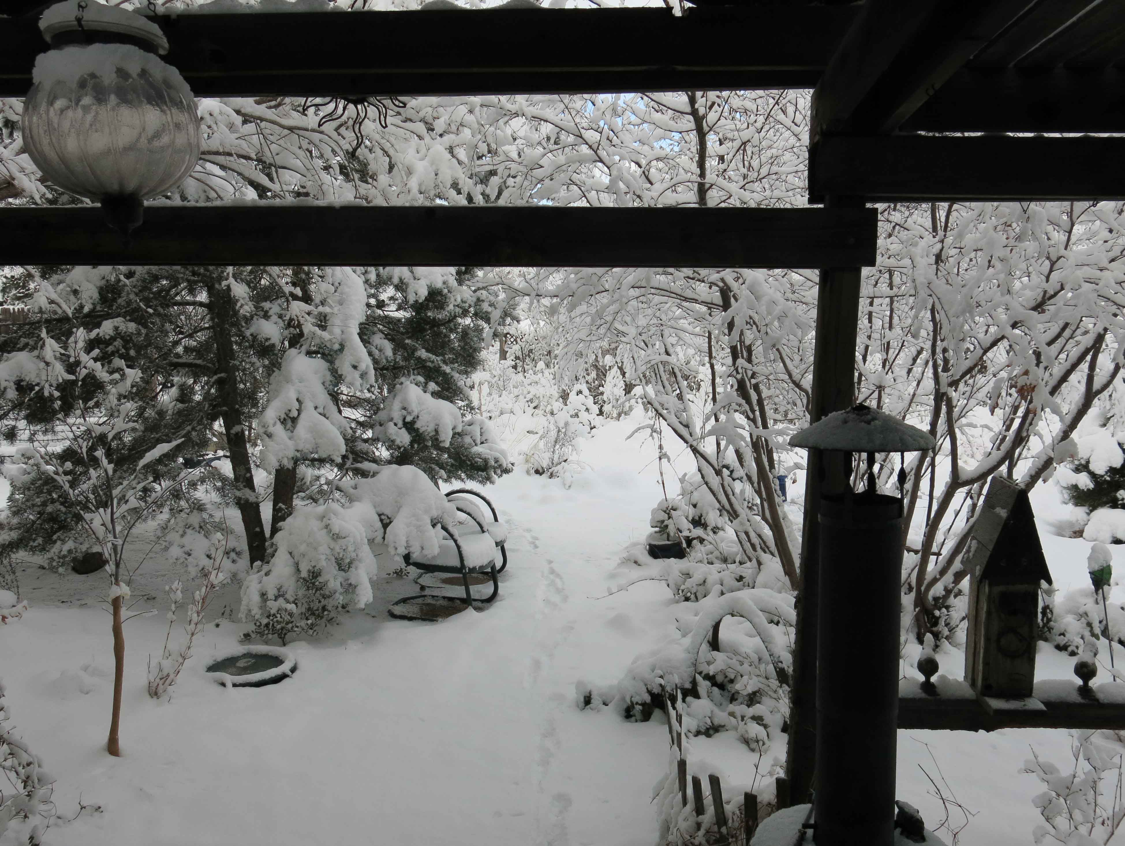 I had to set the alarm for the dog so he wouldn’t sleep in until 10:30 like he did yesterday, and woke up to a winter wonderland….. I’m not one of those people who thinks that snow on the garden in January is “moisture”. I just shoveled a whole bunch of moisture off the driveway; that was fun. The dog stayed inside and watched.
