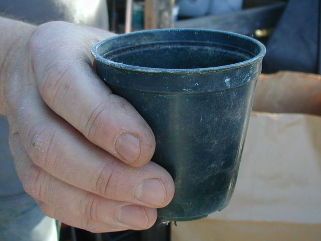 the seed mix, which varies, but usually equal parts screened peat moss, perlite, and sand, is moistened from below, then seeds sprinkled on top. seeds visible in far right pot.