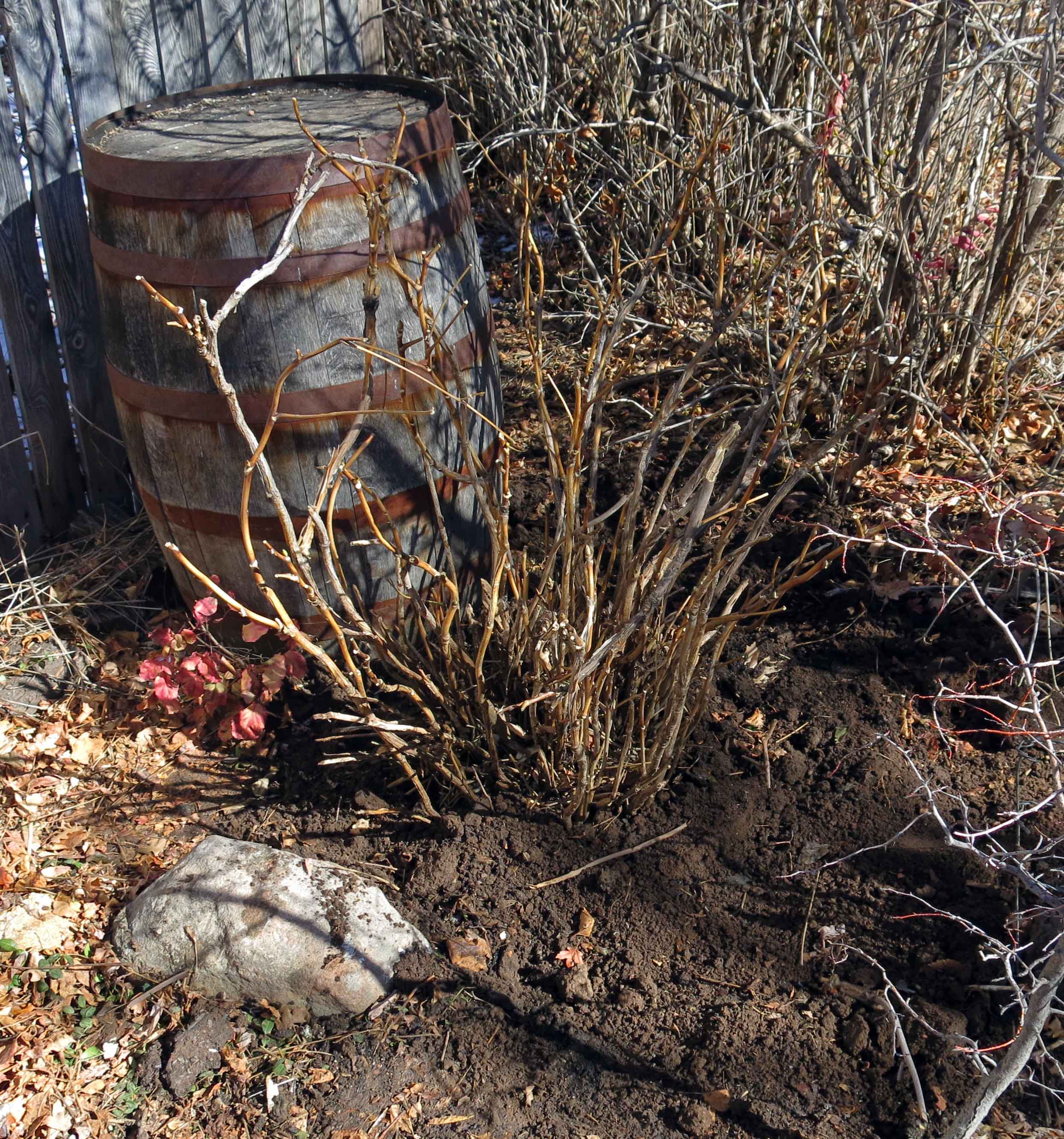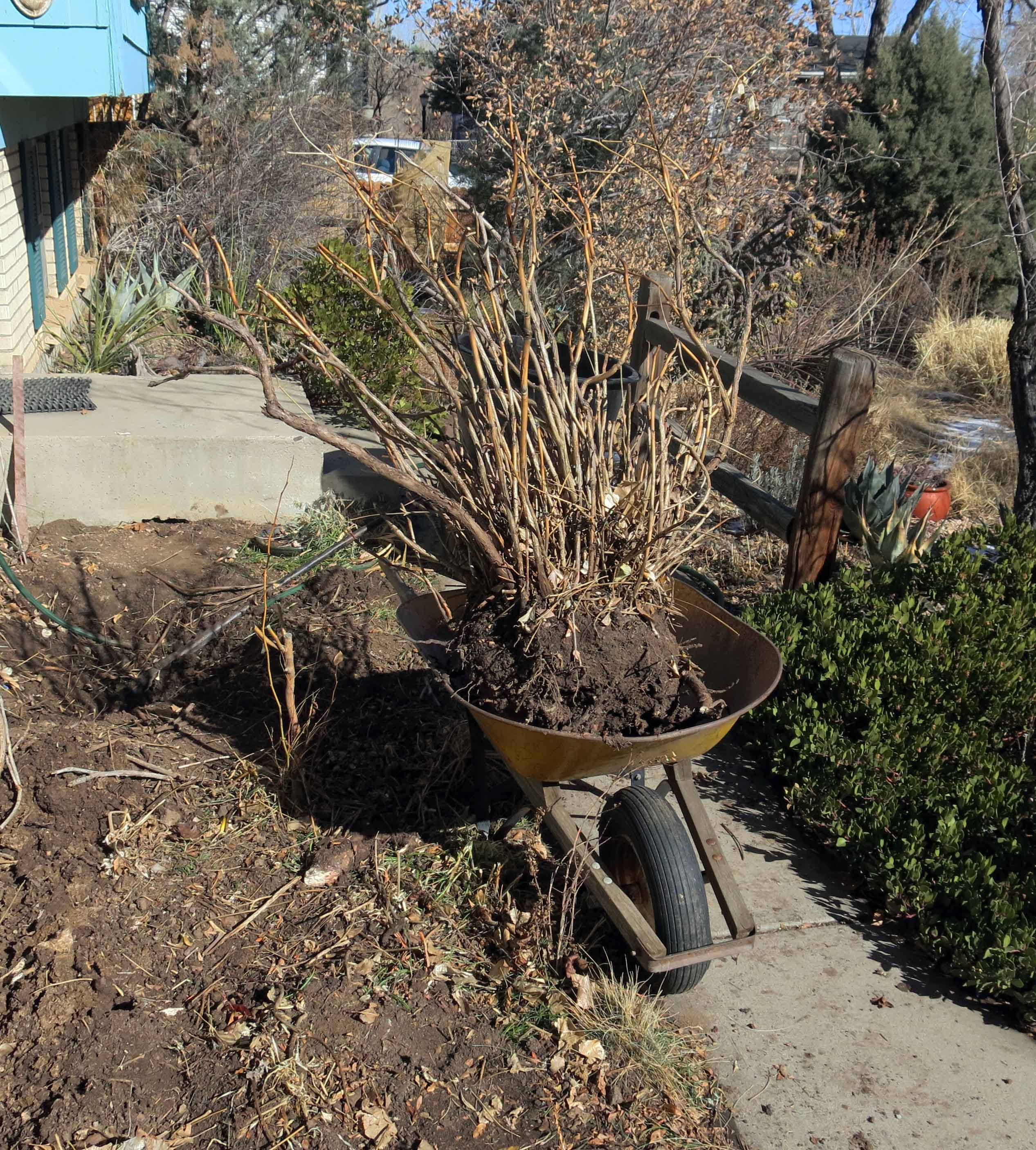I calculate it weighed about six hundred pounds, but a lifetime of gardening has given me the strength to accomplish amazing feats like getting this monster in the wheelbarrow. About half the plant had died from neglect over the last few years, so removing the dead branches meant a little less weight to lift, but the root ball, with the accompanying soil, was another story altogether. The severed roots, which I dusted with sulfur, incidentally, smell like a cross between root beer and cinnamon.