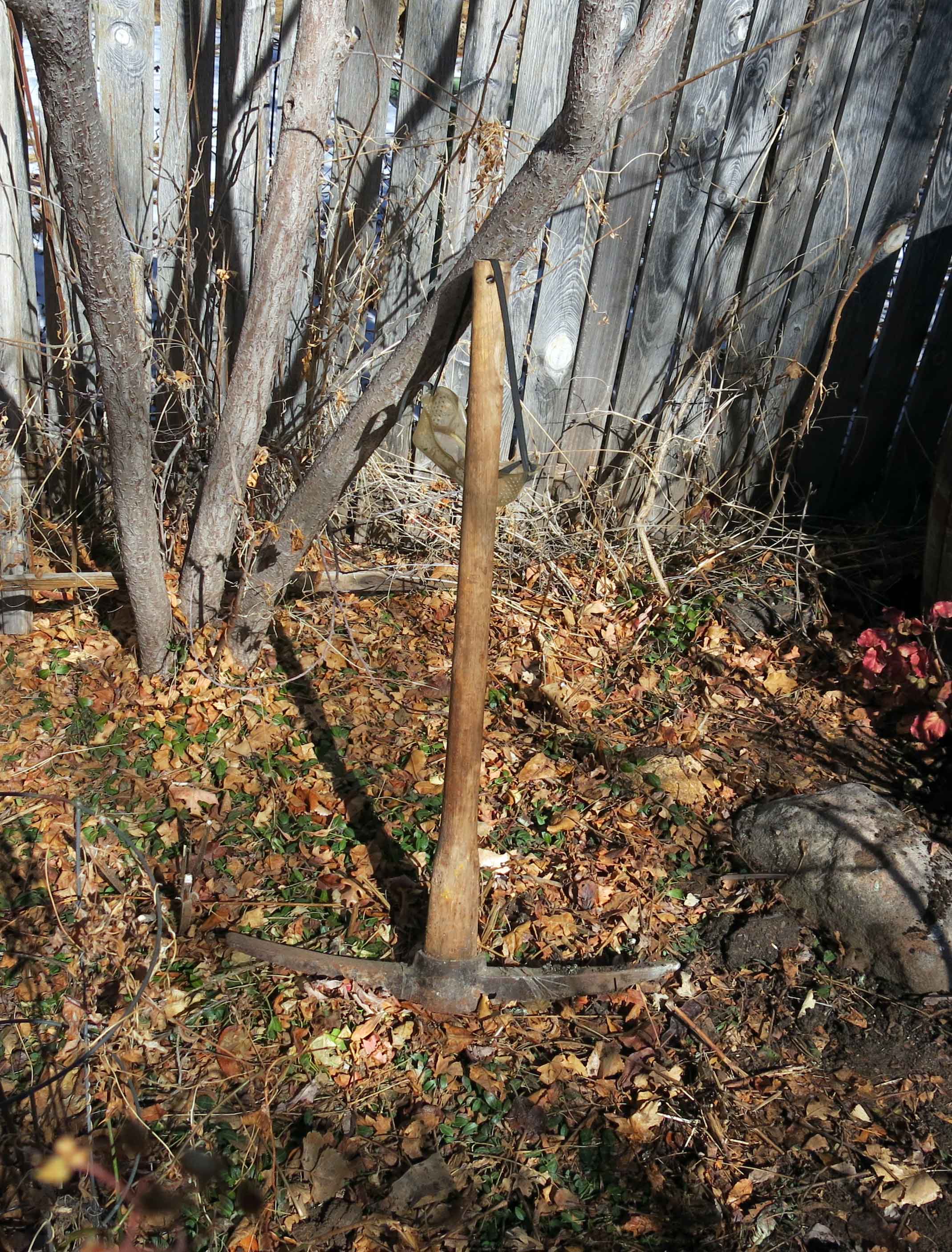 Then off we went into the back yard, to the half shady spot I had picked out earlier. I’m not sure why this spot was empty. The soil there was, of course, frozen. Once again, what some people might consider to be esoteric gardening skills came in handy.
