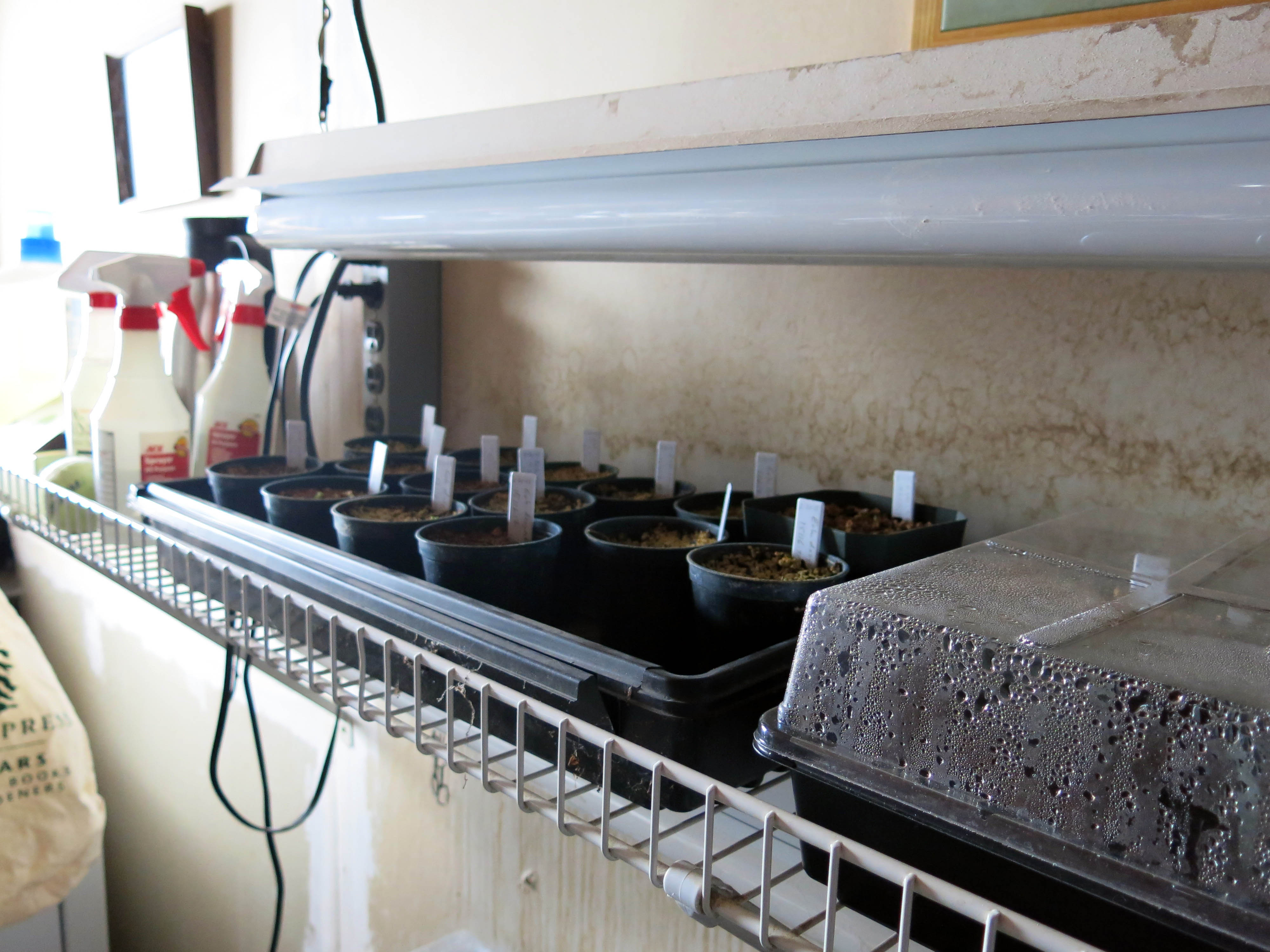 This is the cactus seed germination flat on the lower shelf. It has a heating mat underneath; the lights are about a foot from the pots, one plant-growing type, one regular light. I check for fungus every day, but the seed mix, bagged mushroom compost, bagged sand, and perlite, is relatively sterile. One of the spray bottles contains Bordeaux Mixture, just in case.
