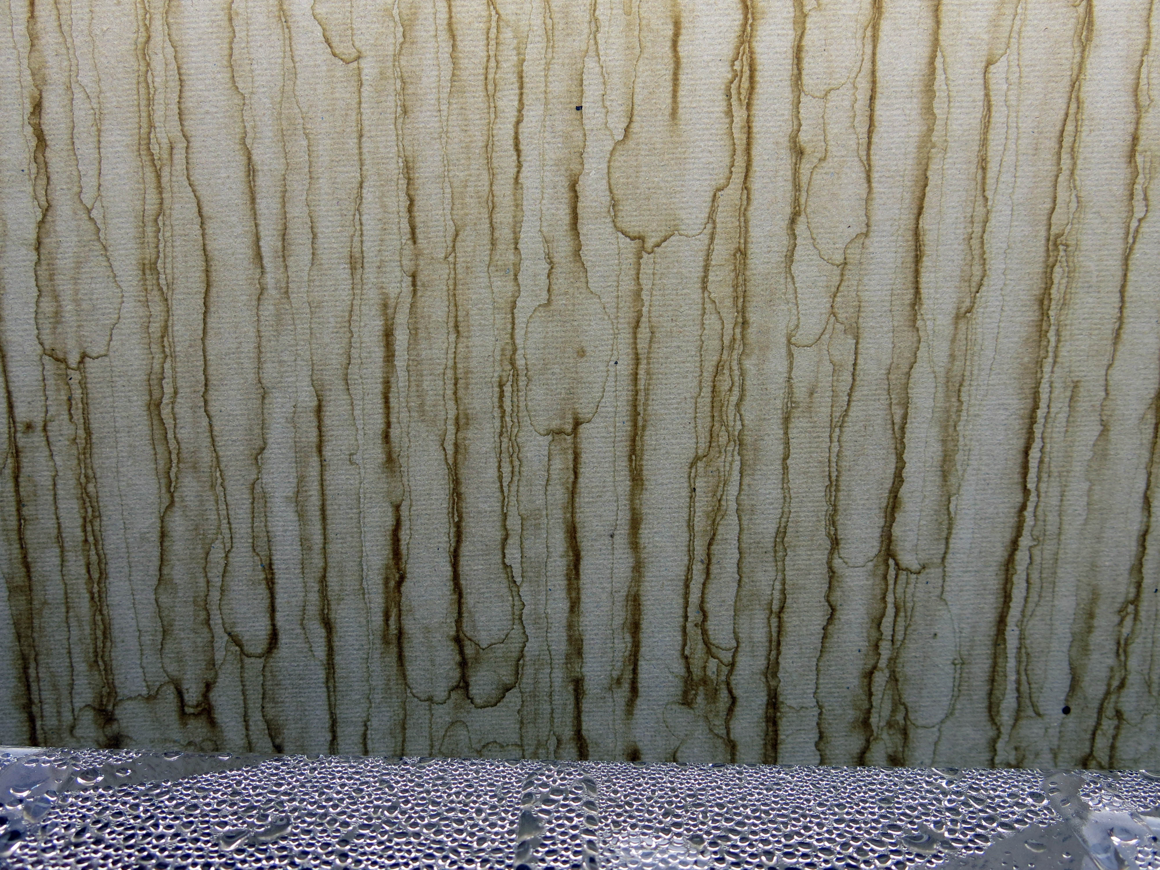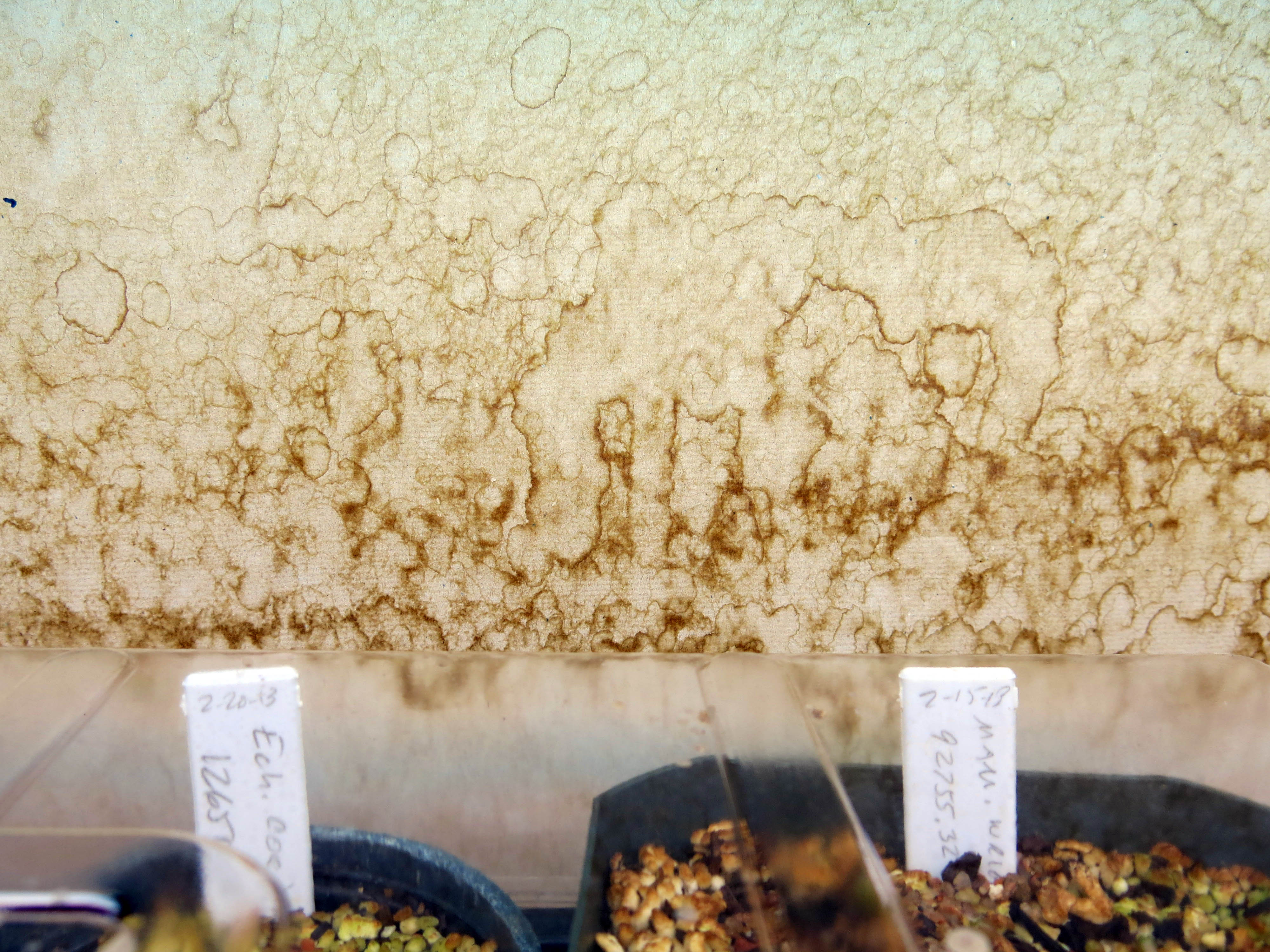 These shelves have been used for seed sowing for a quarter of a century; the water patterns on the drywall remind me of the decalcomania paintings of Oscar Dominguez and Max Ernst.