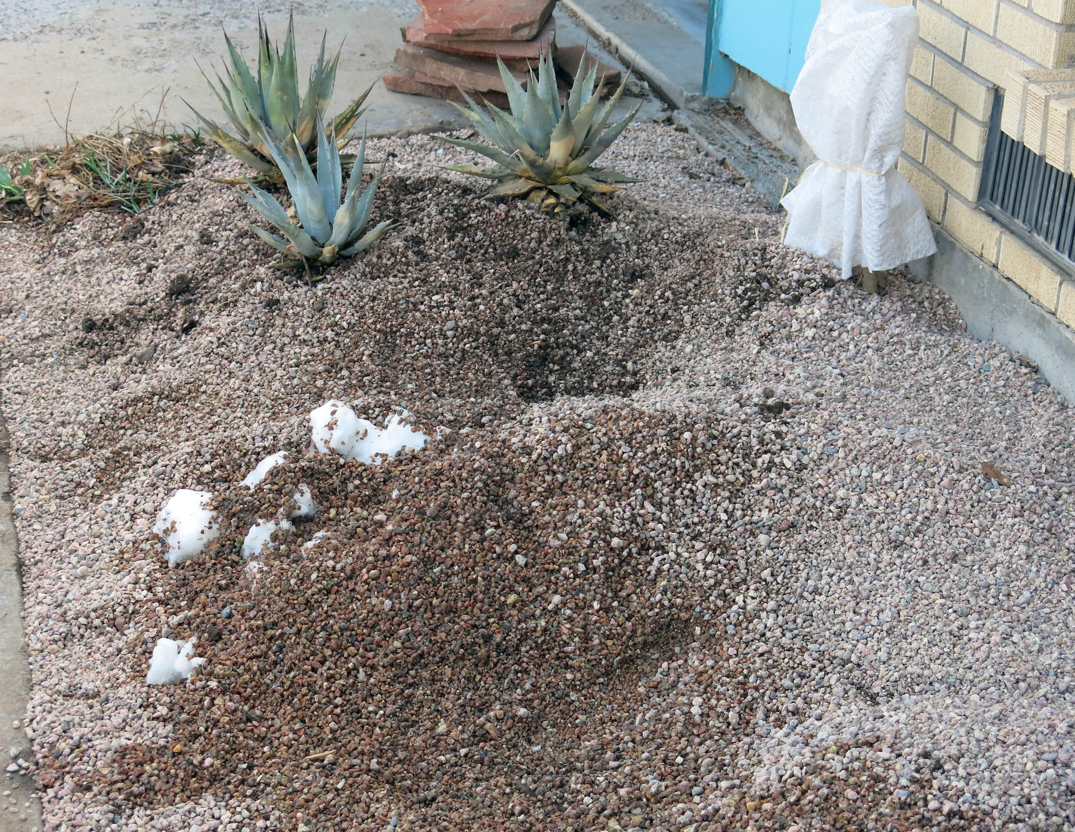 The agaves might not stay there permanently (into the back yard instead, in a place where snow doesn’t linger so much), but at least they’re away from the street and the snow plow, and the possibility of being covered with slush every few days.