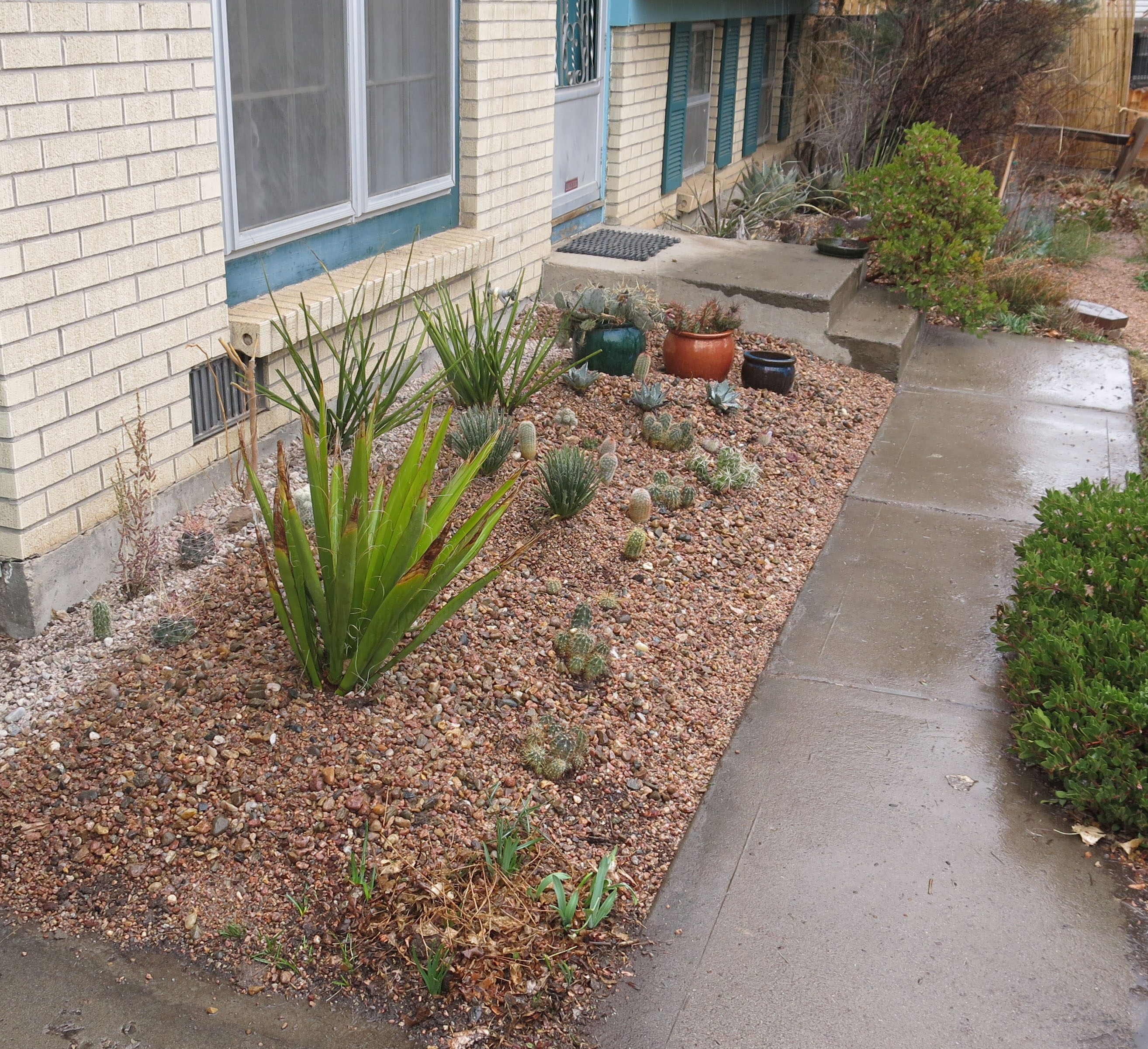 In deference to Desert Dweller I moved the Yucca faxoniana, not as far as he suggested, but moved it nonetheless. Visitors will just have to beware of the thing. (The picture makes it look like it’s farther from the driveway than it really is.)
