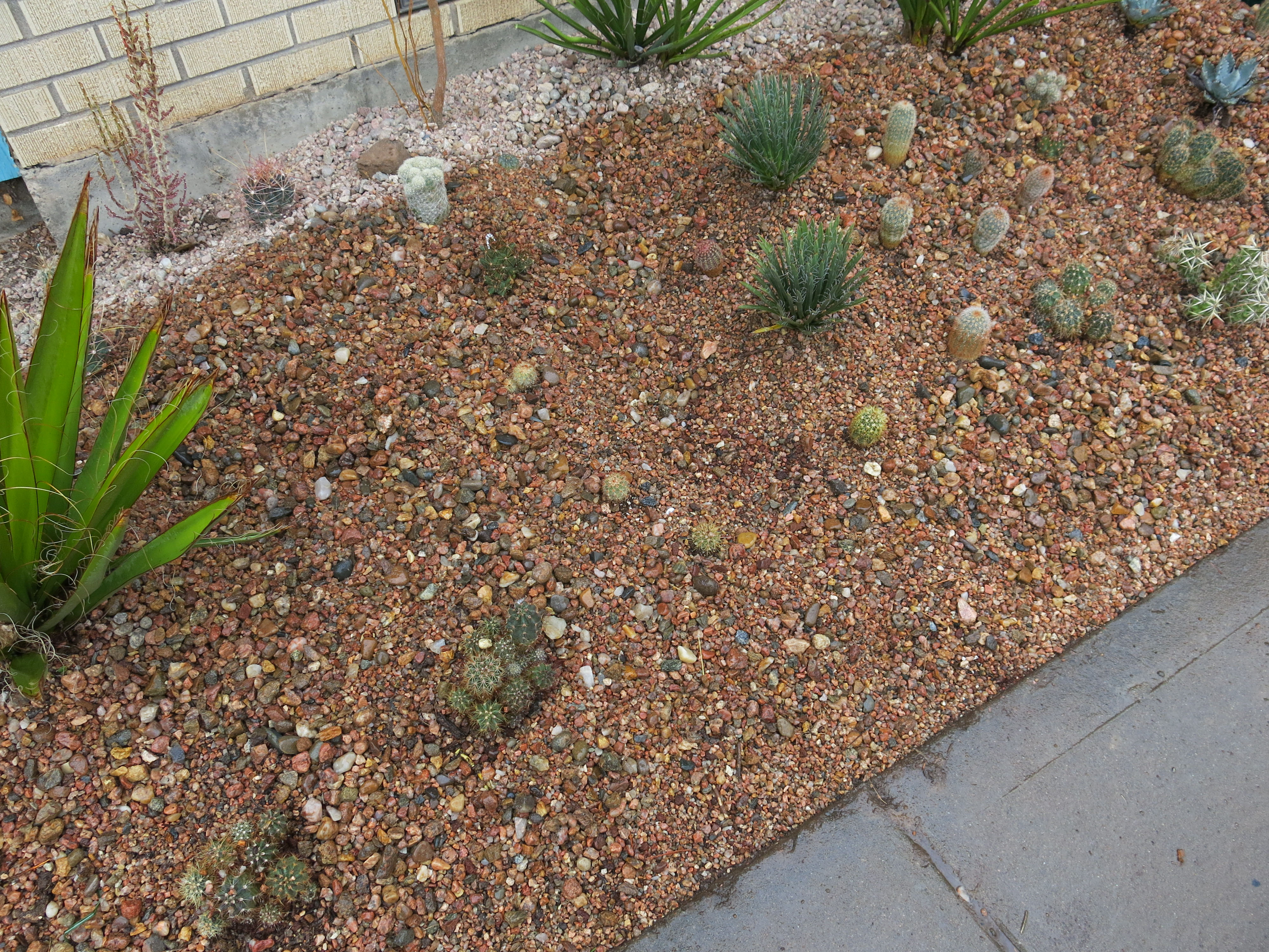 I also moved the three Agave parryi out of this garden; there was too much feng and not enough shui. The pots with cactus were moved from their place along the path because it’s a drag brushing against them. The little blue pot is empty, creating an air of mystery and suspense.