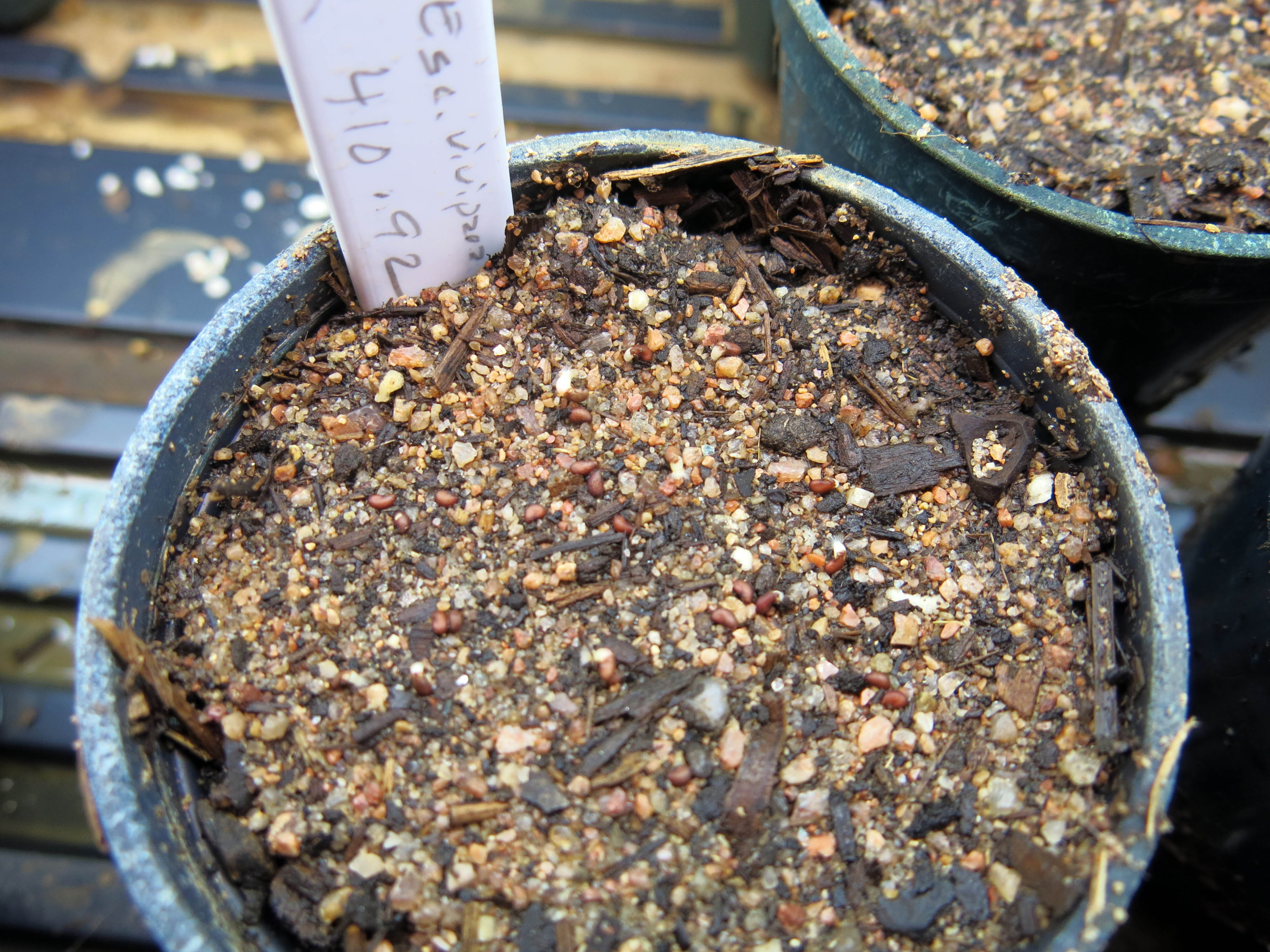 Down in the laundry room, more seeds are germinating. I sowed several packets of Escobaria vivipara from Mesa Garden exactly one week ago. The seeds were surface sown (visible in the picture), misted with a sprayer, no pretreatment. They germinated last night.