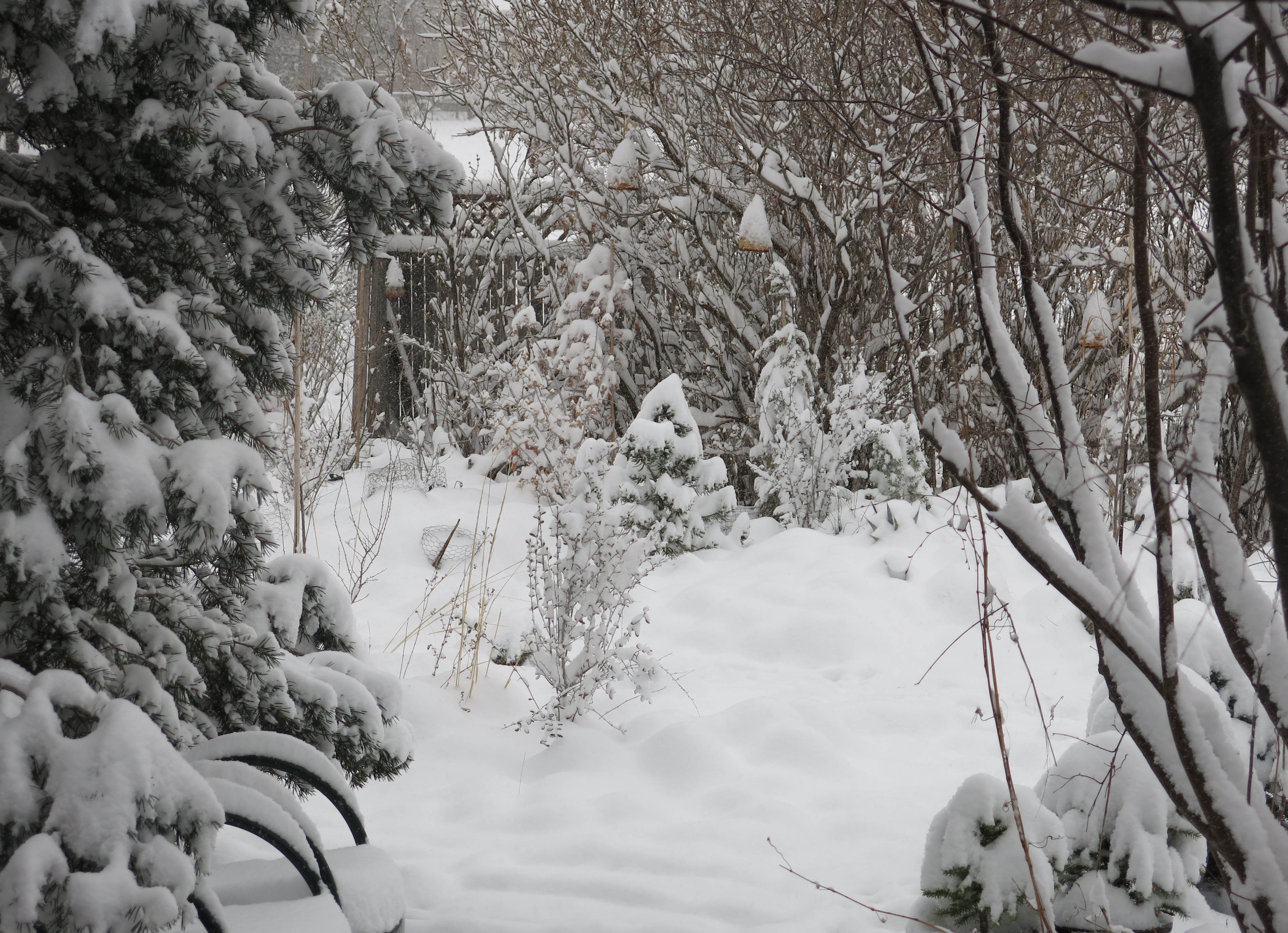 Yup your snow arrived here (in south central Ontario) too and I expect to get the shovel back in action on white instead of brown earth tomorrow morning. It is so depressing admiring little seedlings under a fluorescent light rather than those pushing out of the warm spring earth. I think I’ll take up knitting again!