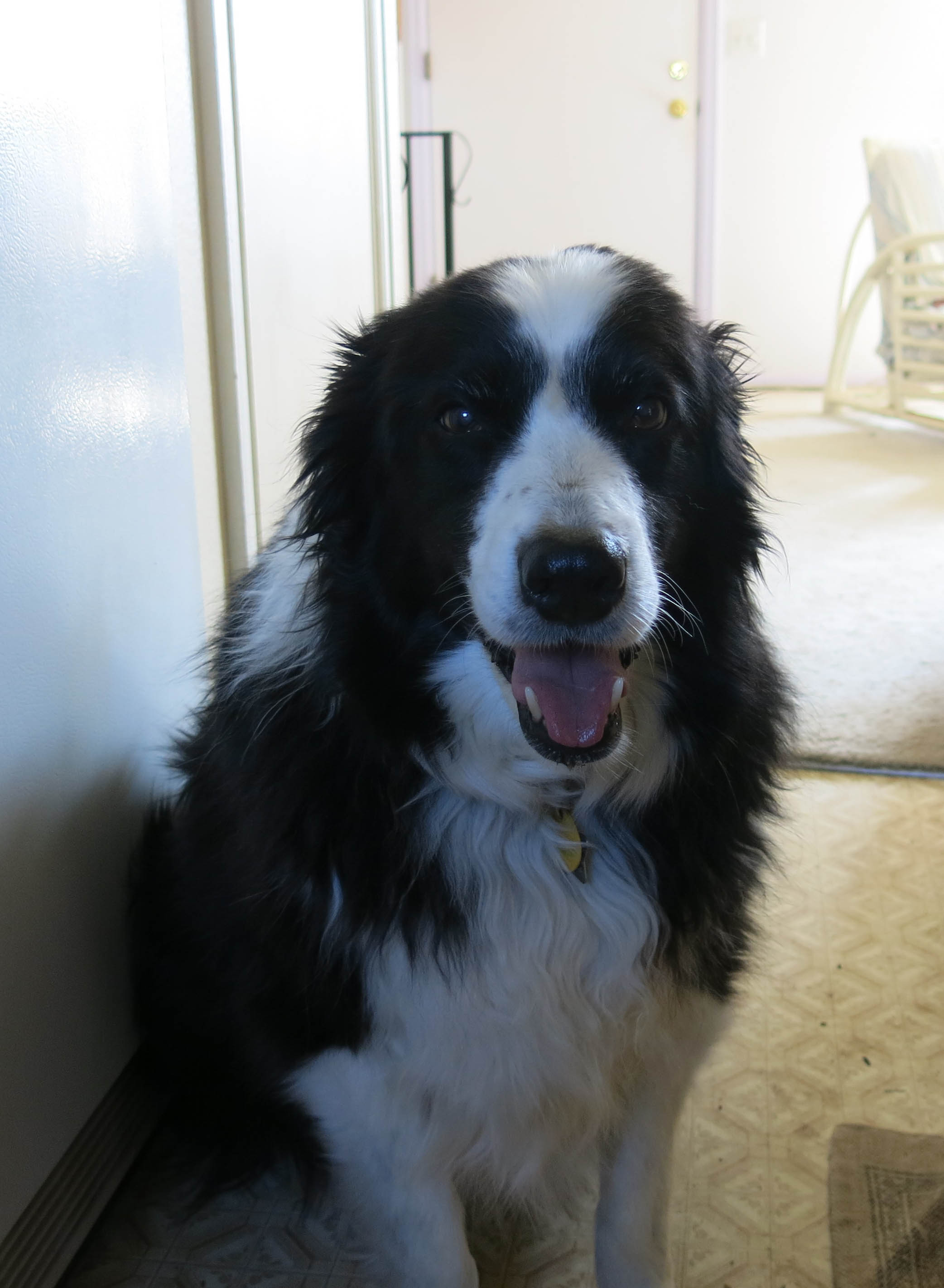 Hi there, it’s me again, Chess the border collie. Here I am standing in one of my favorite places, right in front of the refrigerator. There are biscuits in the cabinet next to the refrigerator, which is why I stand there. I know how to hint.