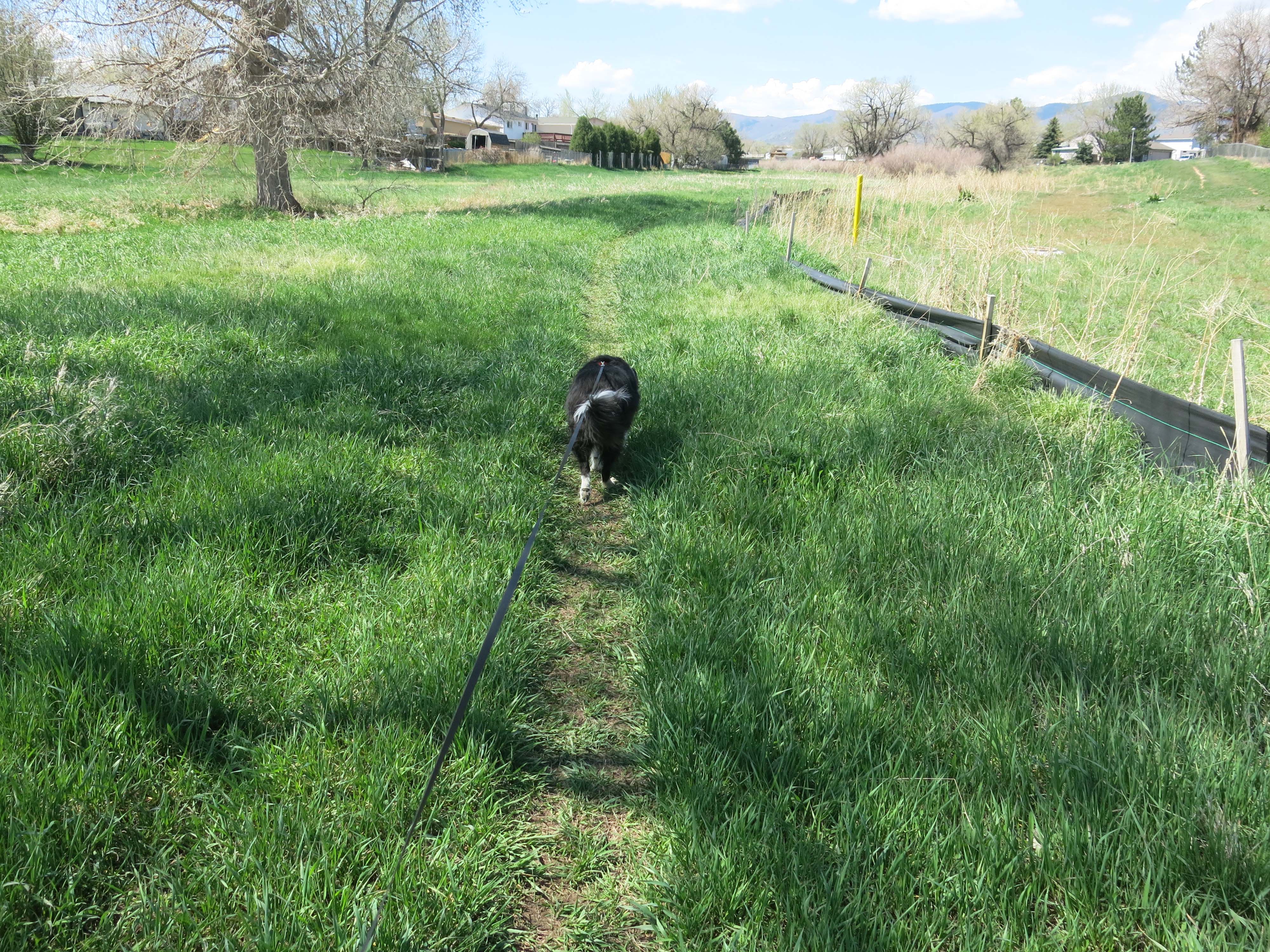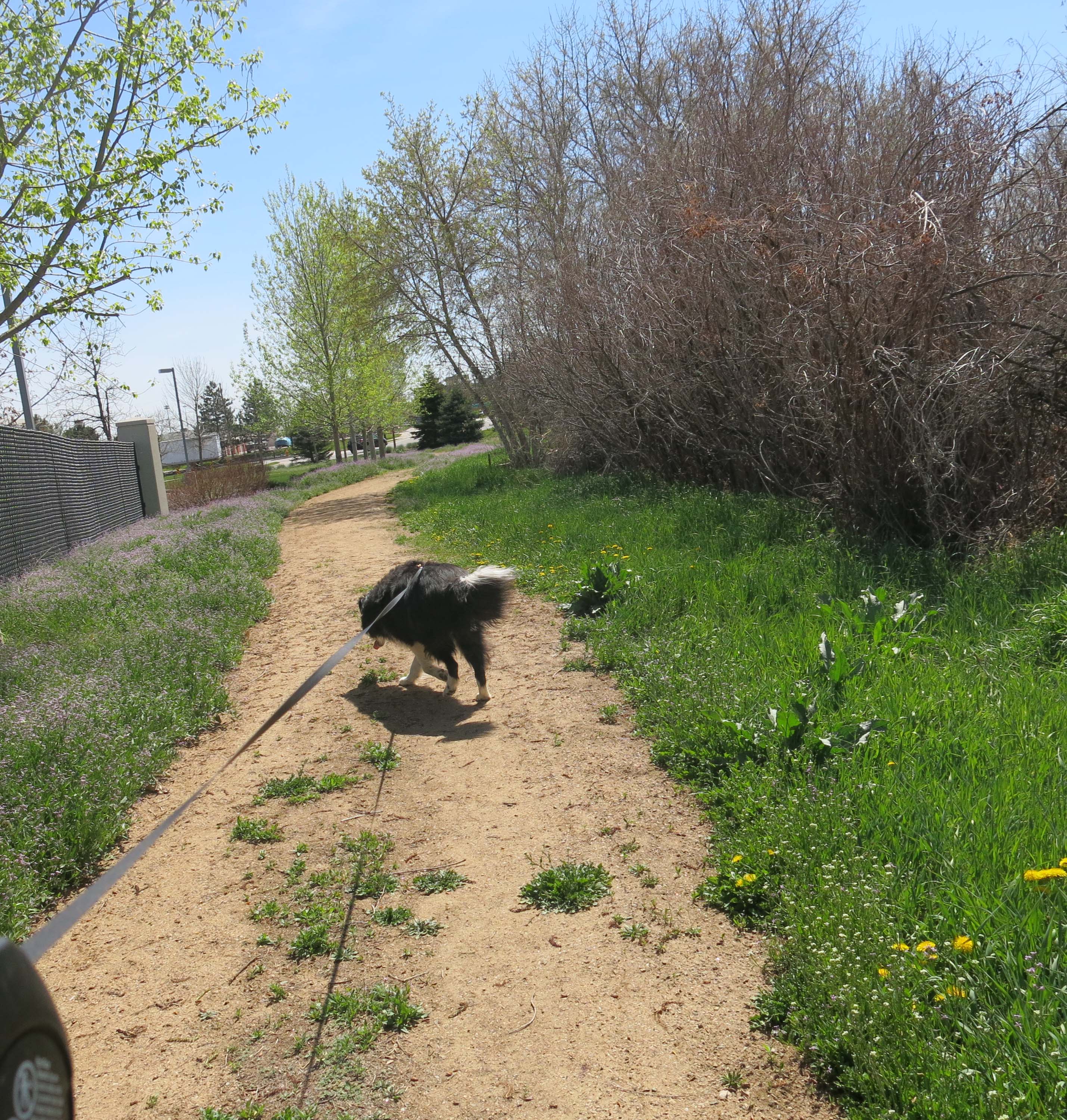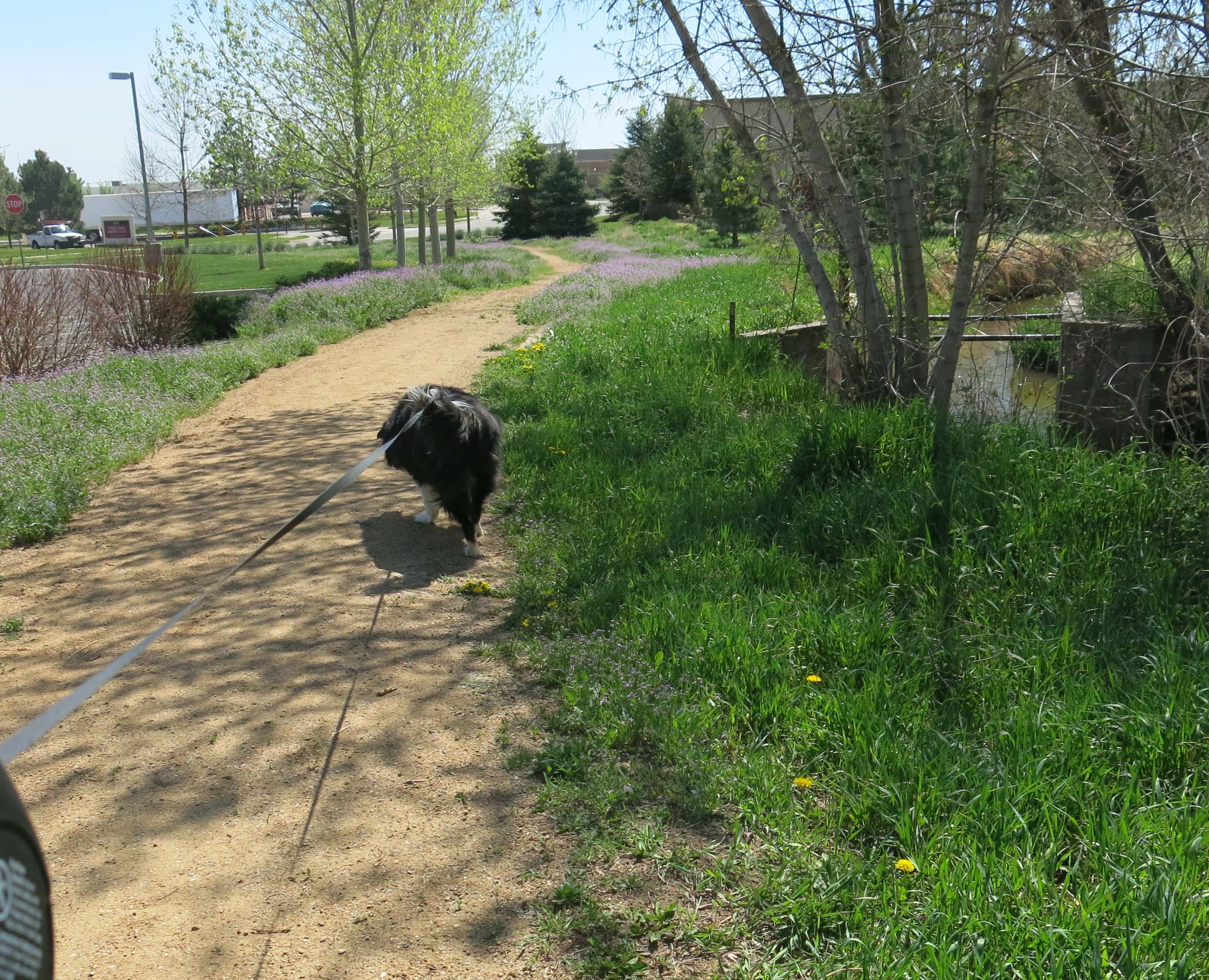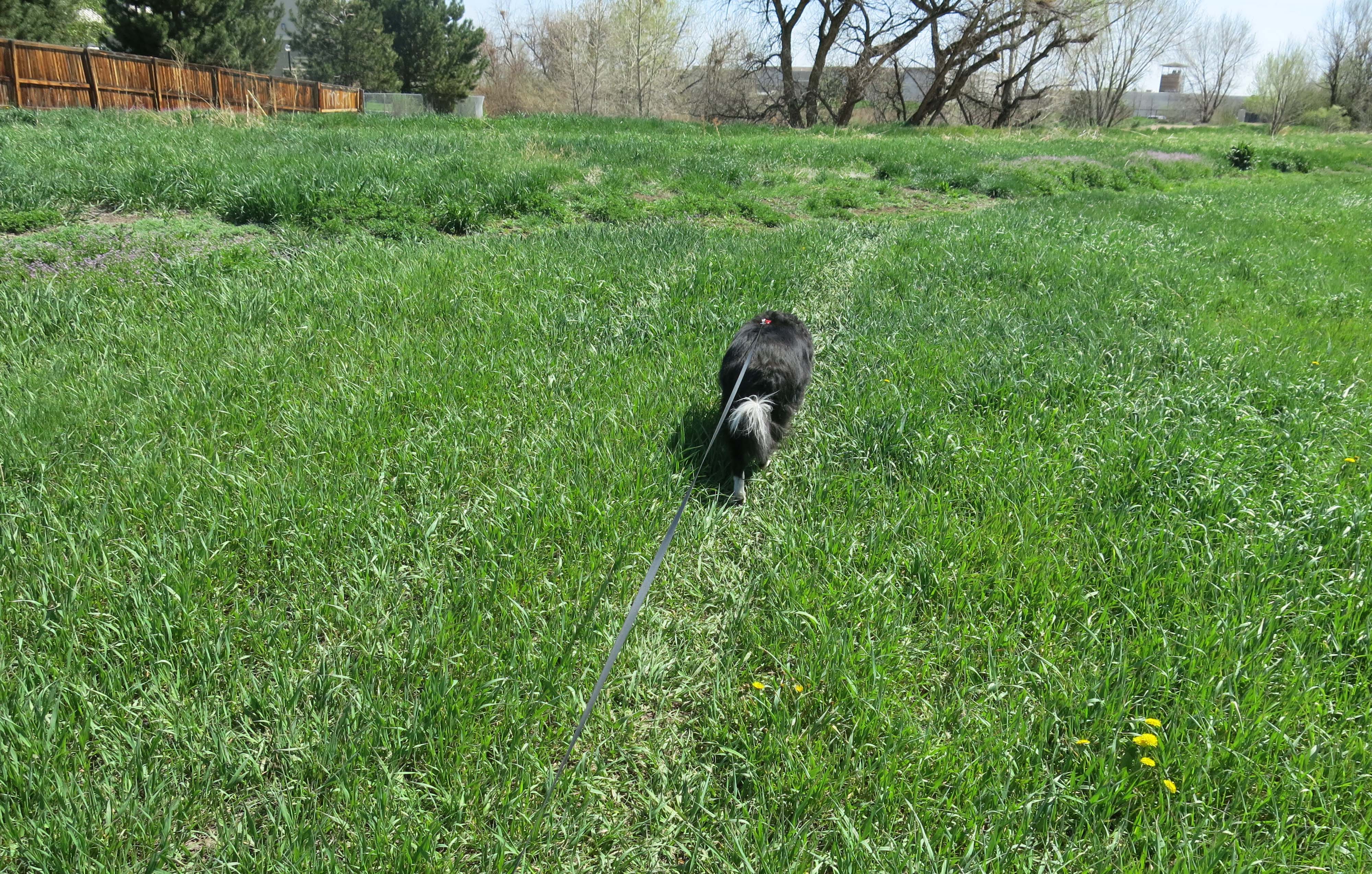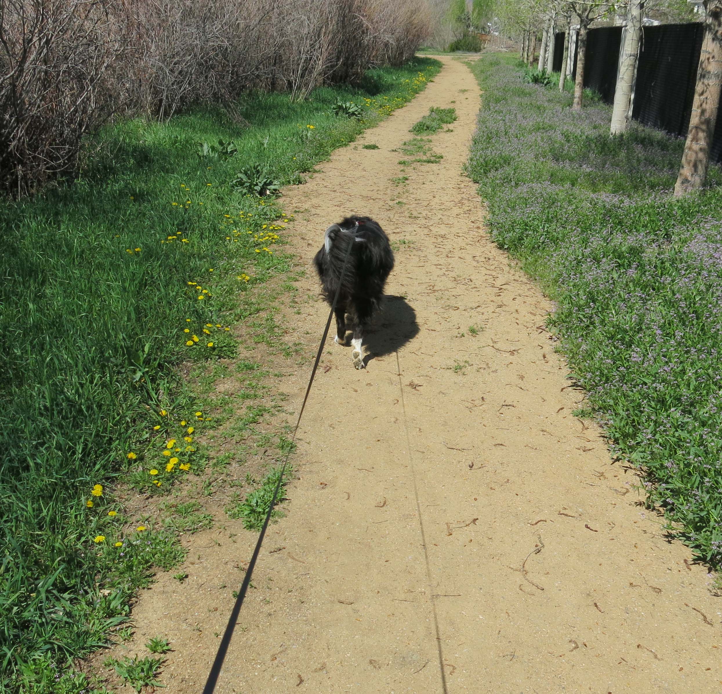 The path goes past the willows visible in the distance, and the tree, though sometimes I get really tired barking at everyone and exploring and so we turn back before we get to the end of the path.