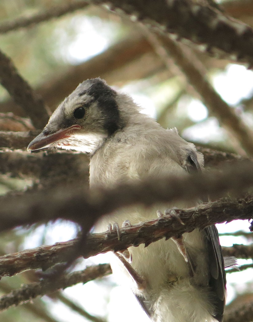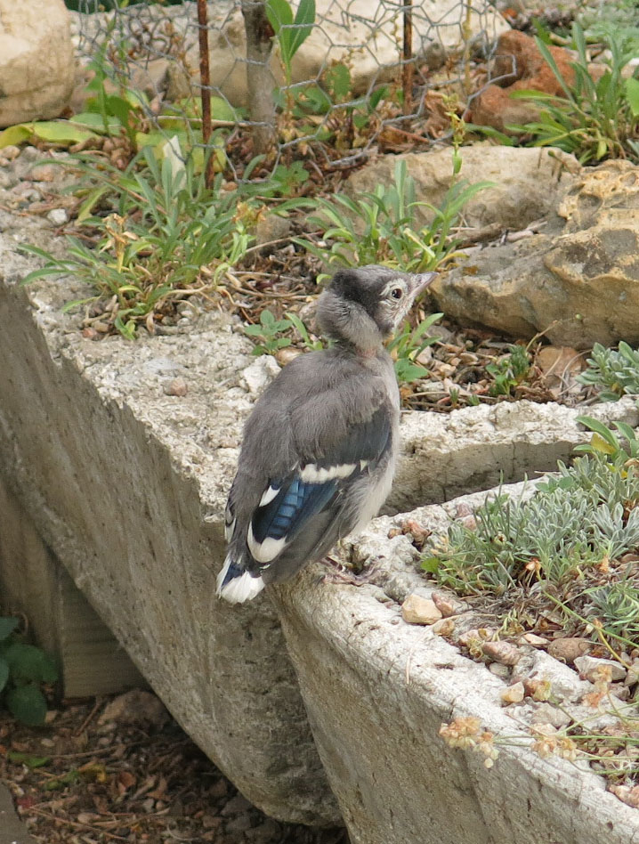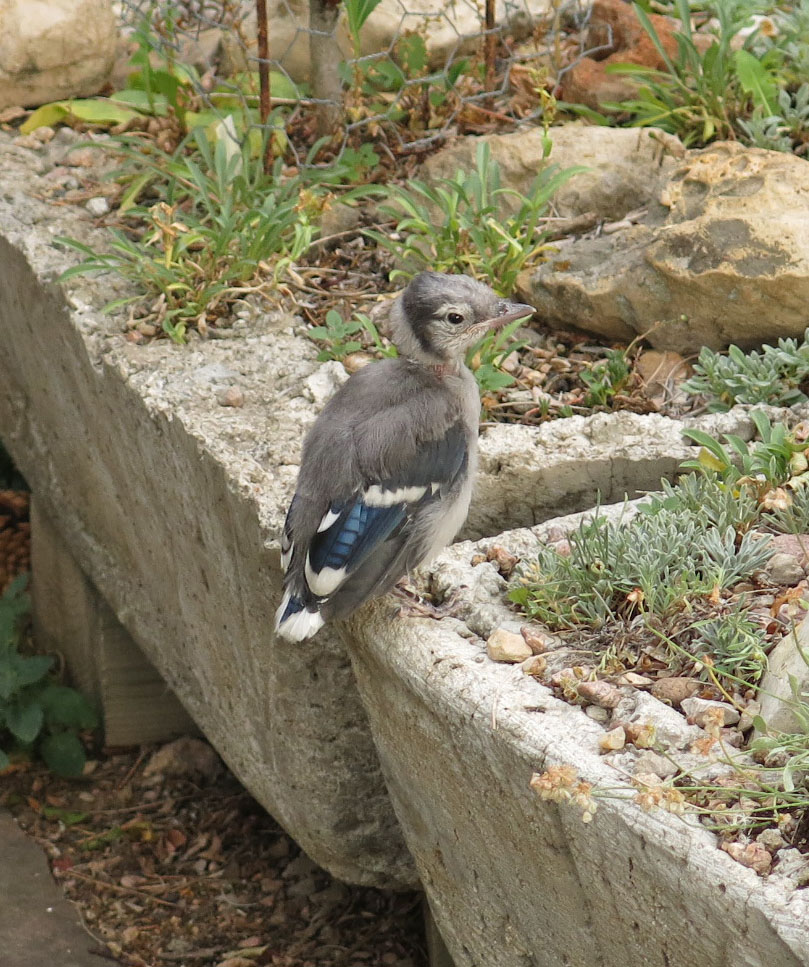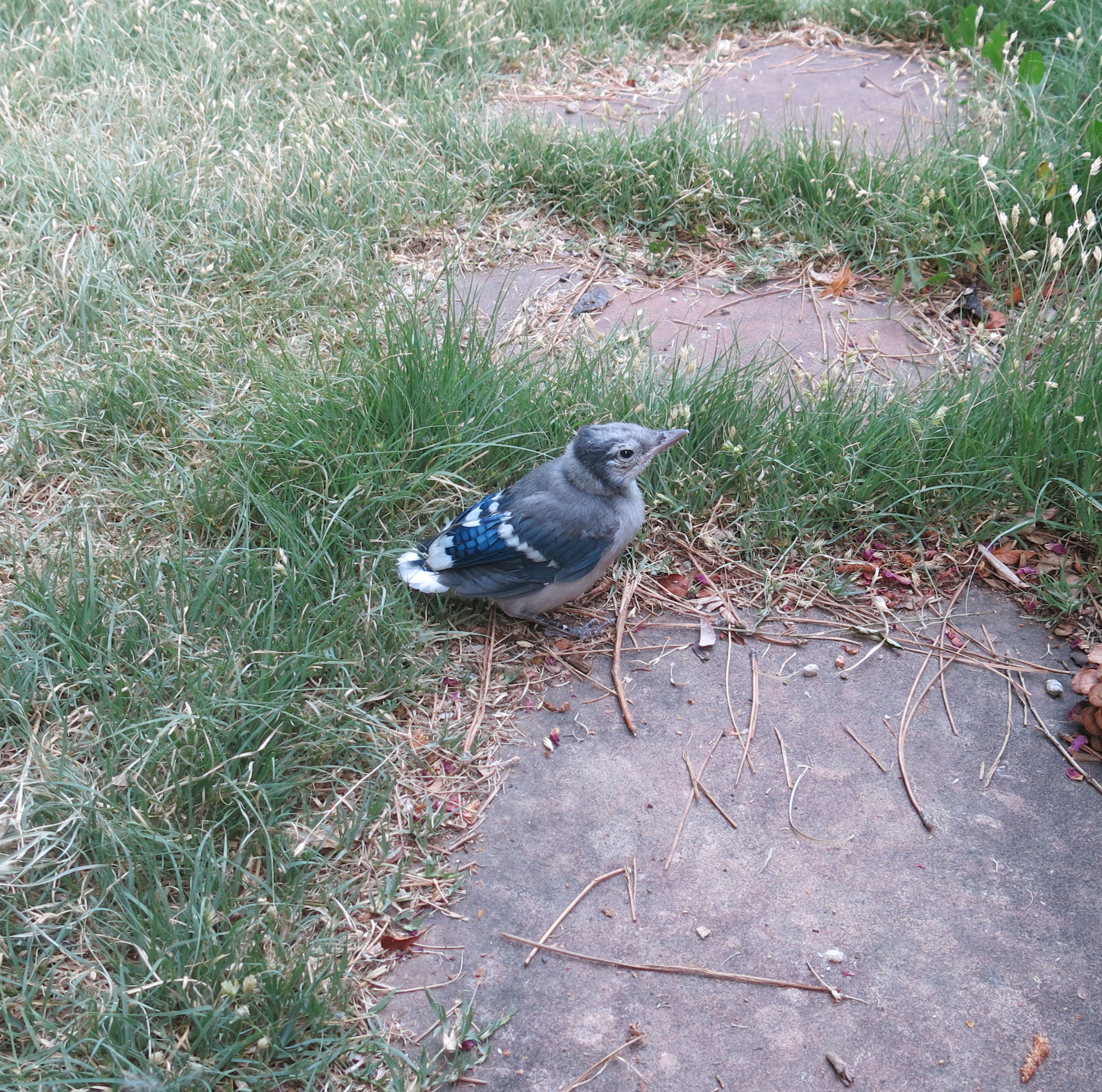 So, that’s probably why it came as a complete surprise that there was a nest of blue jays in the yard. This afternoon, he went onto the patio and there were two baby blue jays, which he claimed were cute, and took their pictures. I’ve been instructed to show them. They aren’t as cute as I was when I was little, but, after all, I set new standards for total cuteness. Anyway, here they are.