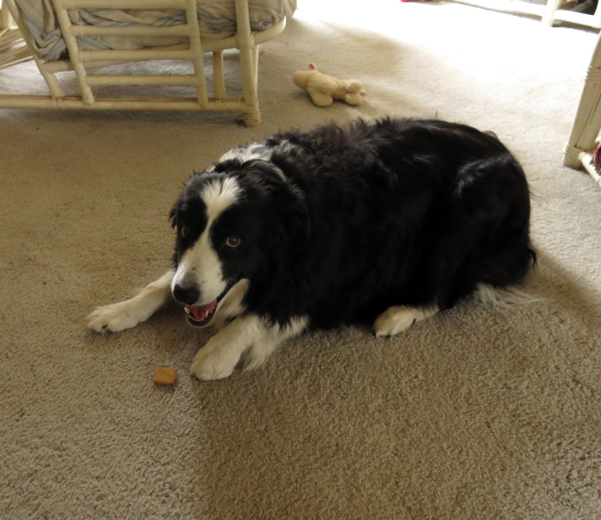 Here I am in a characteristic pose, about to eat a biscuit, and at the same time hoping I don’t hear thunder. I’ve been hiding downstairs all day and really should go back down there. It’s cooler, too. That’s my “fetch ‘n’ cuddle” behind me, and that’s the guy I live with’s ancient rattan furniture. Older than him, even. Like, really, really old.