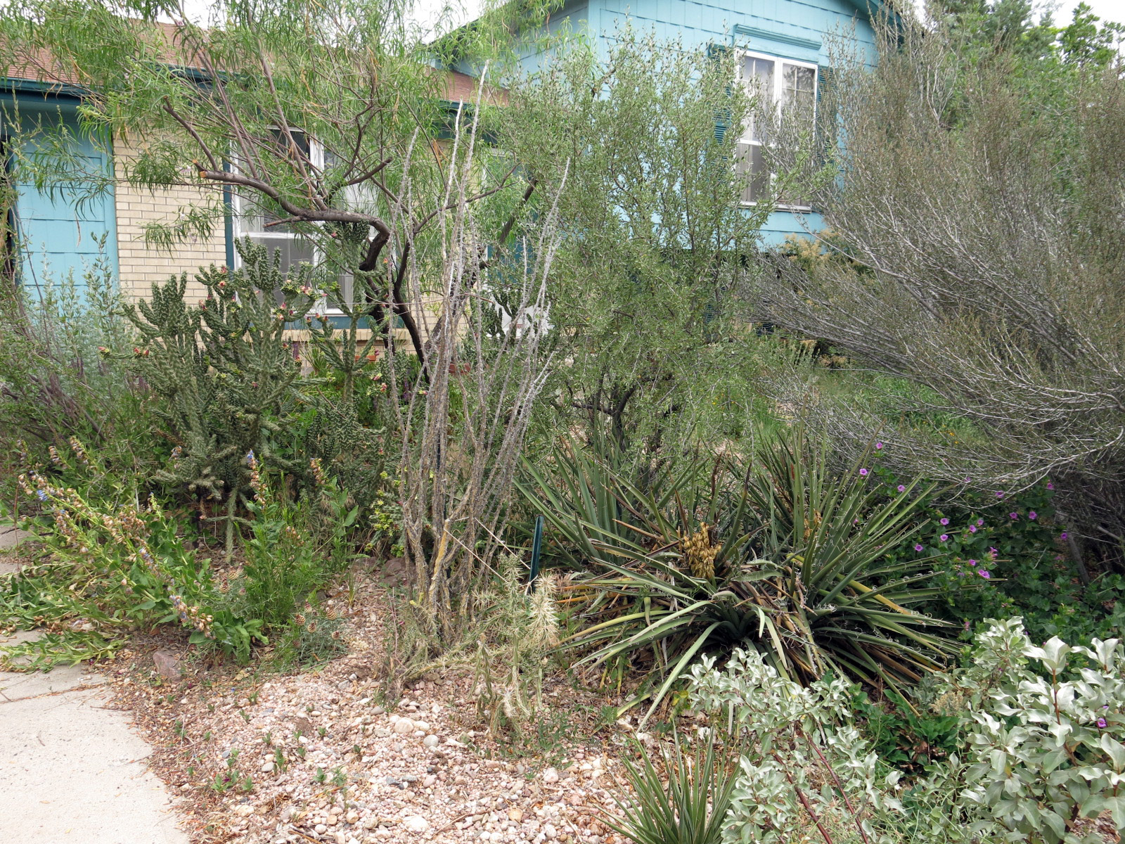 He didn’t take a very good picture, but my mommy said the garden wasn’t very photogenic, and she took all the pictures then. Those aren’t weeds in the lower left corner; they’re seedlings of Penstemon brandegei, the big green thing above it. The dark curvy branches are the desert willow, Chilopsis linearis, which I’ll get to in a minute. The ocotillo is front of it is probably dead, but there are so many plants in the garden that are probably dead that the guy I live with doesn’t even worry about it. It’s architectural, or so he says.