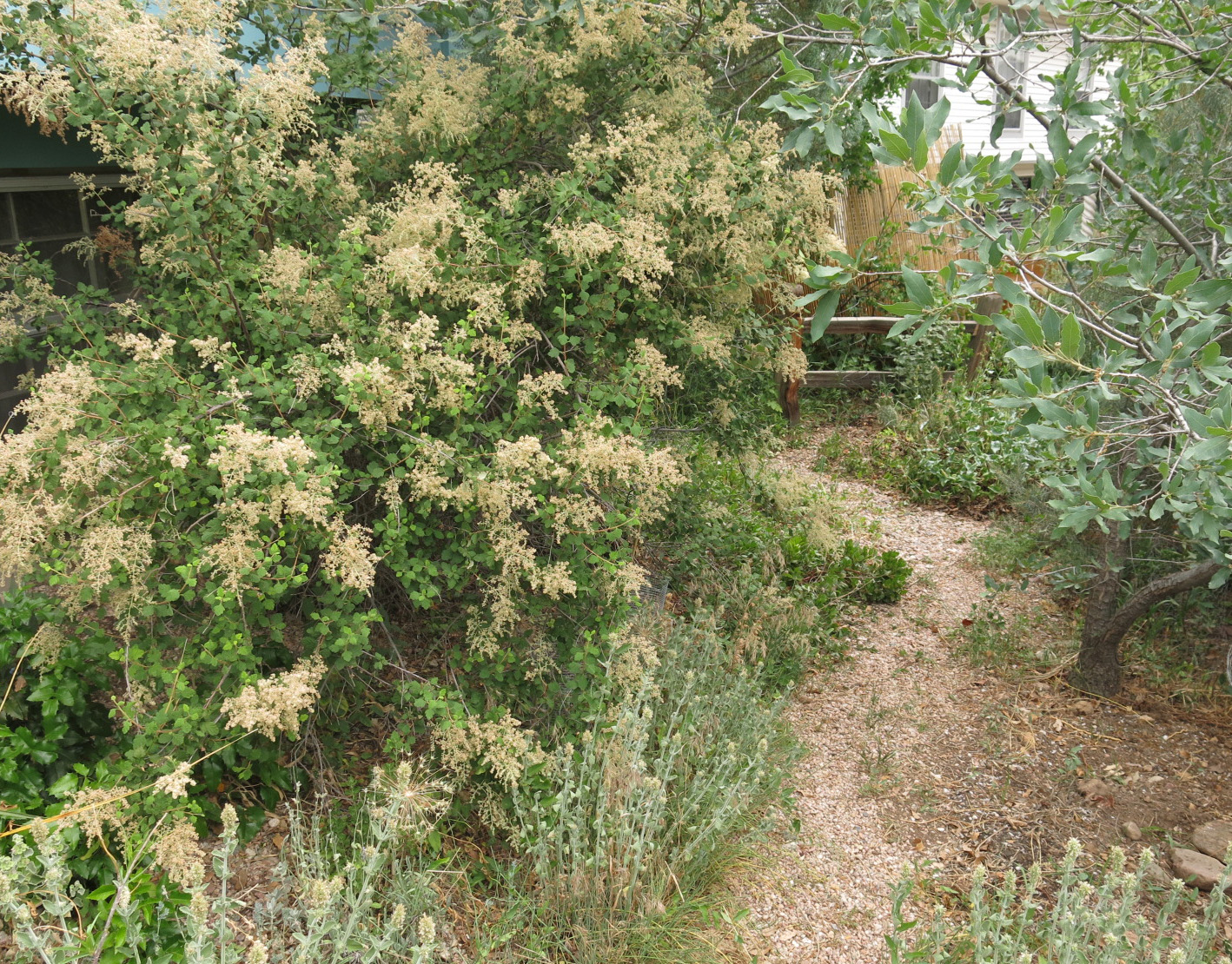 And here’s the path leading from the front into the back yard. Holodiscus dumosus is just “going over” as the guy I live with says they say. That’s an oak on the right, Quercus undulata.