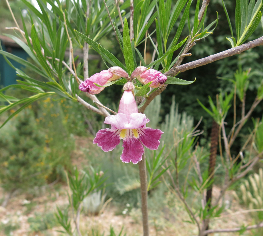 Before I go back downstairs I’m supposed to show some flowers of the desert willow. This is one of the guy I live with’s favorite plants; the flowers are scented of violets at night. One of the desert willows here still hasn’t leafed out, even though it’s alive. The guy I live with says this is being extra smart. Like me.