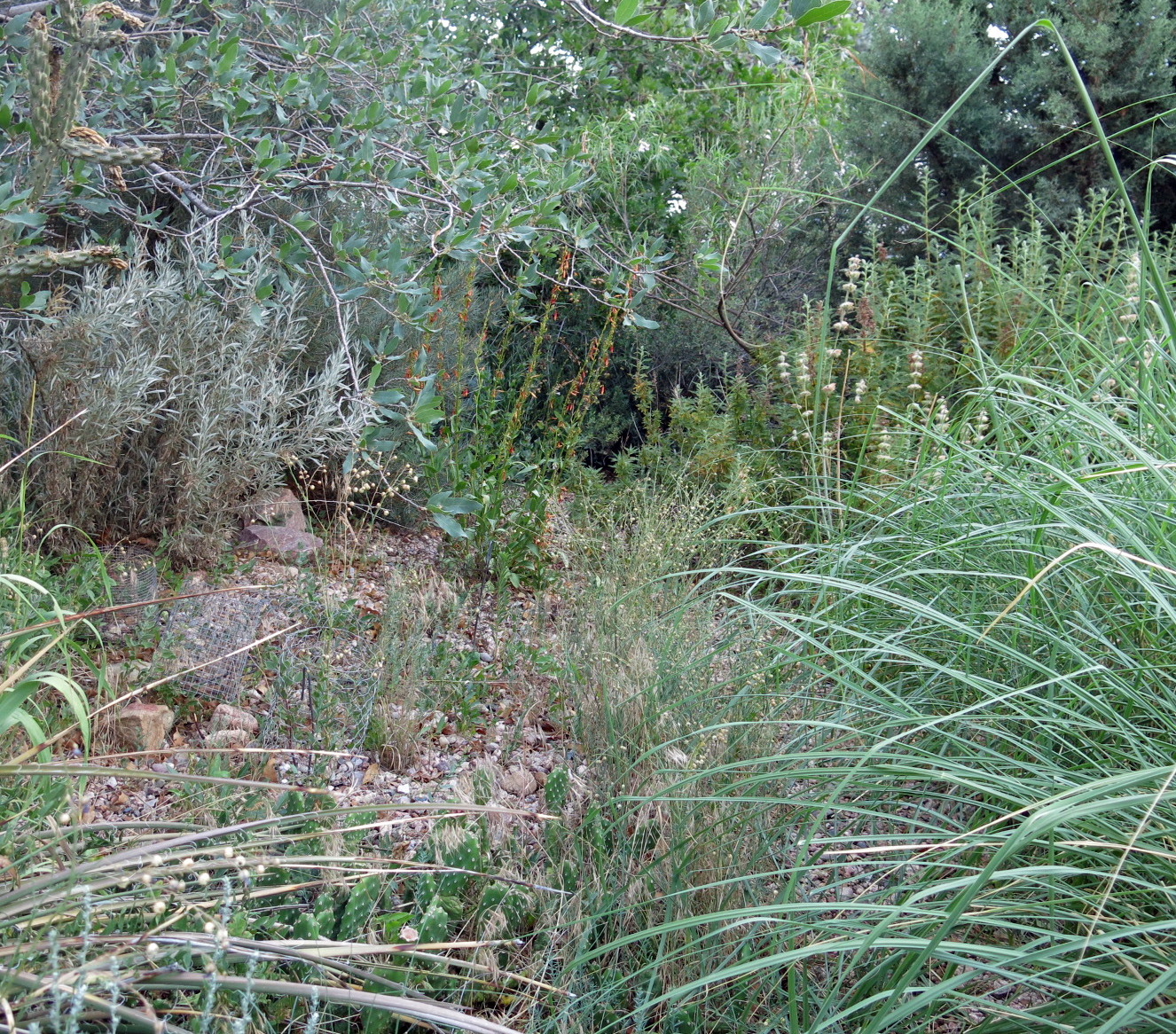 Not too many plants are added to this garden, because, since it’s not watered, the soil is extremely dry, and keeping young plants alive is very difficult, unless they’re planted late in the year, even as late as November. The exception is warm-season grasses, which make no root growth at that time, so they have to be planted early.