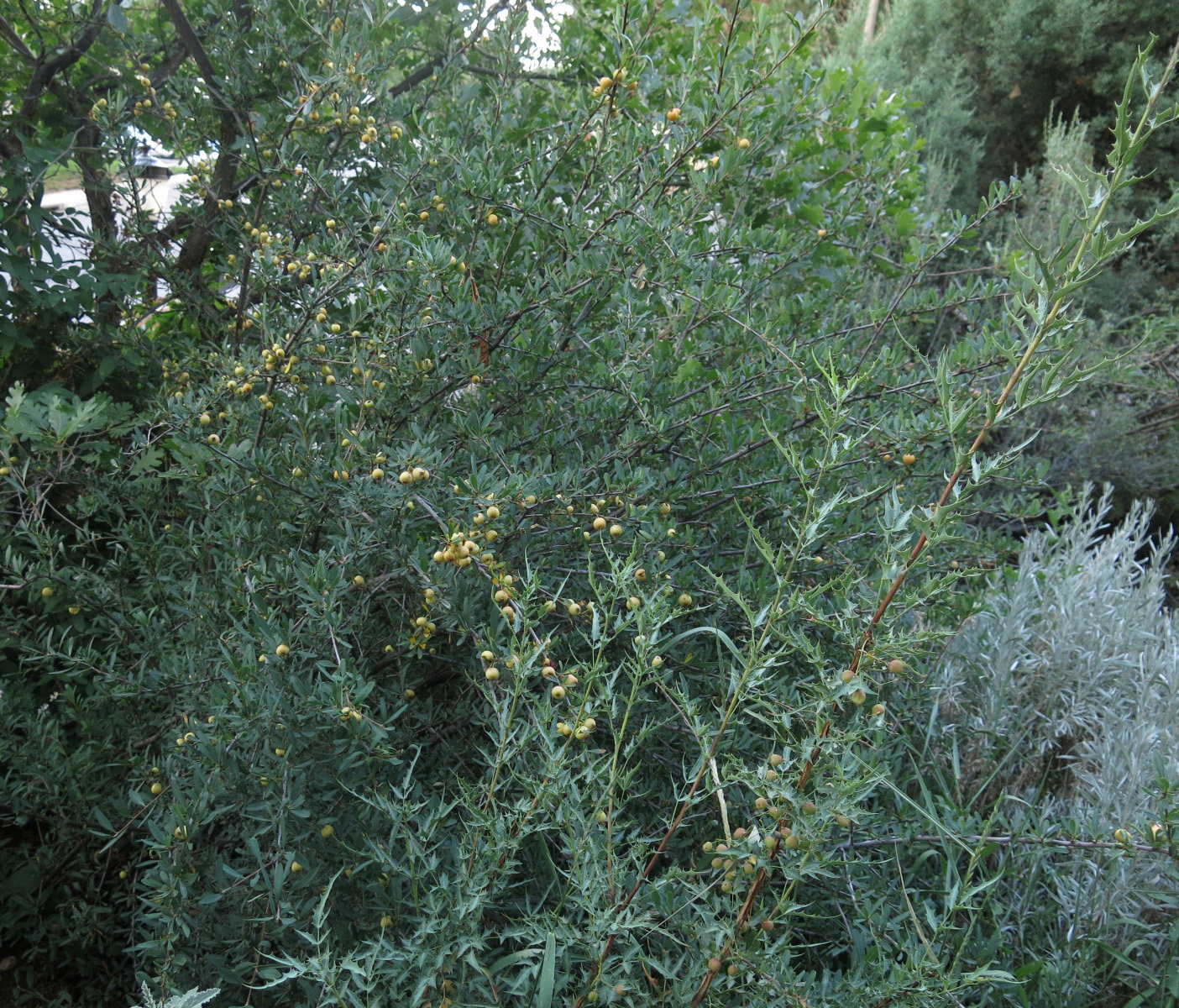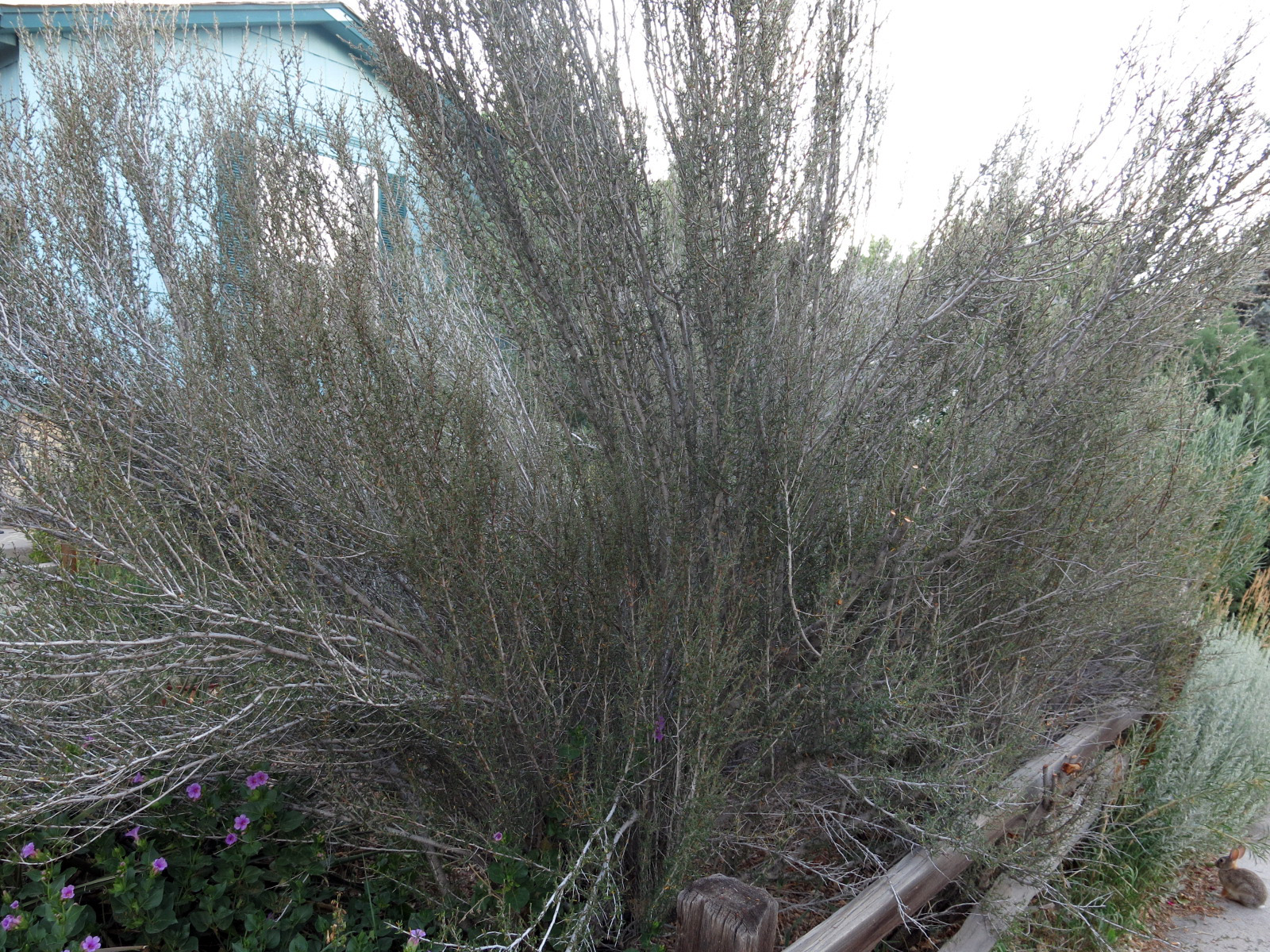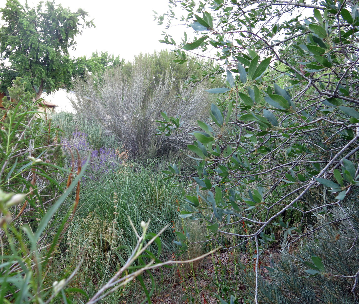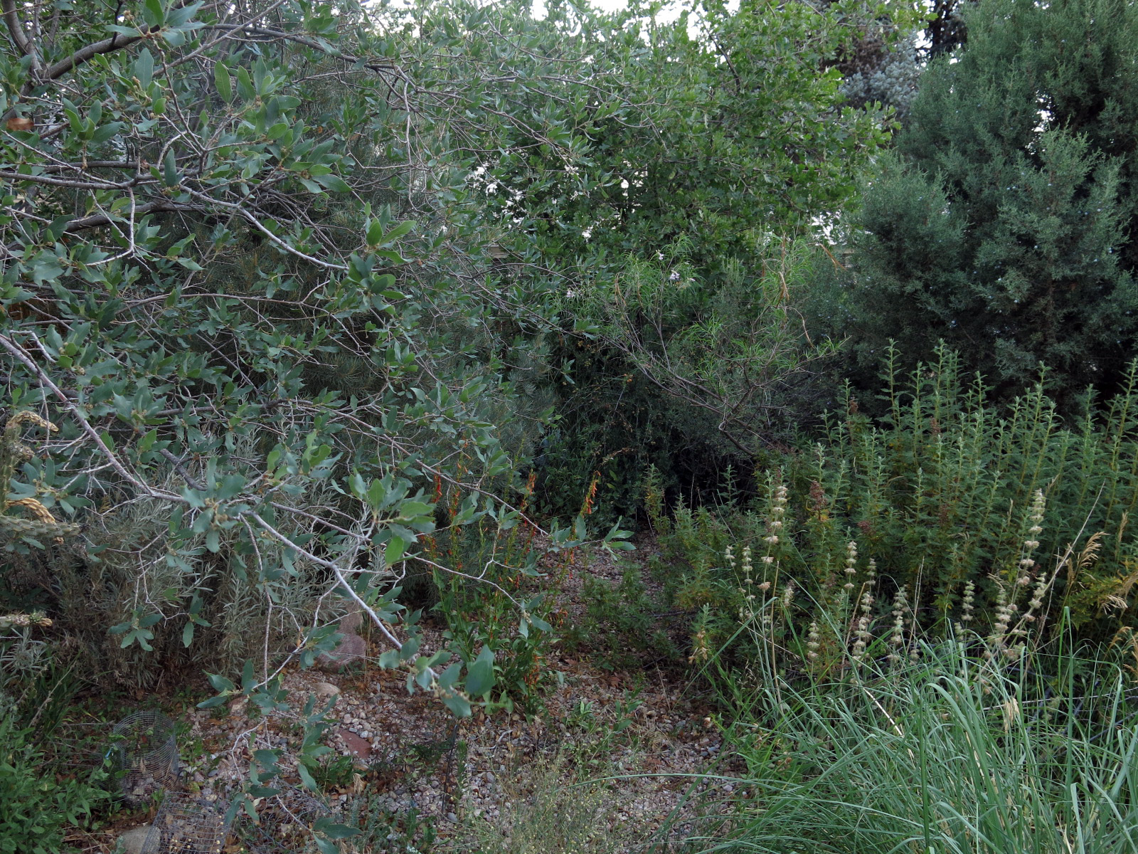 The squaw apple, Peraphyllum ramosissimum, starting to fruit, with Mahonia (Berberis) haematocarpa in front, and Artemisia cana completely blocking the path. The guy I live with doesn’t let people who pronounce Peraphyllum like it was spelled “Peraphylum” into the back garden. Or Chilopsis with a ch like cheese, either. Unless English isn’t their first language, then it’s okay.