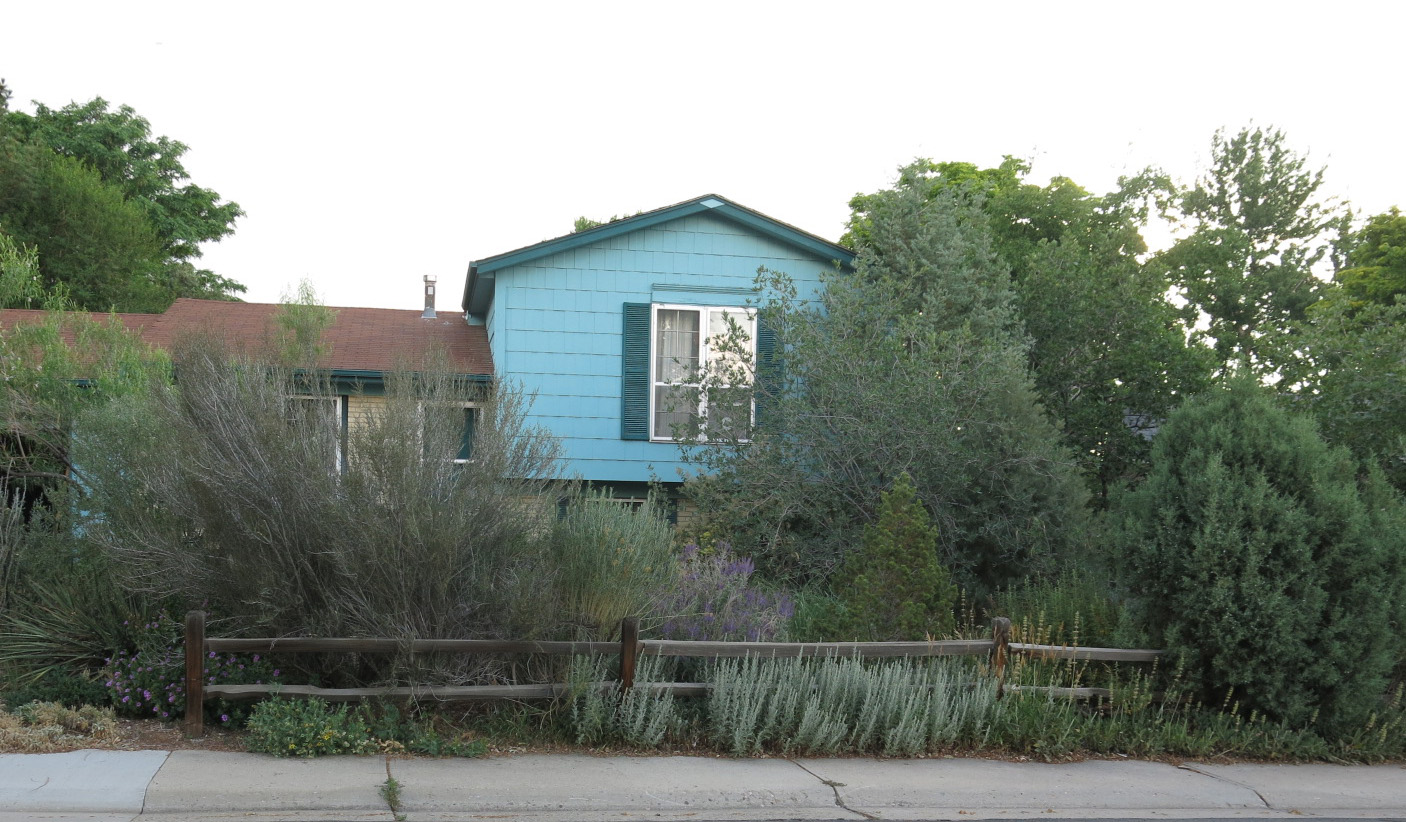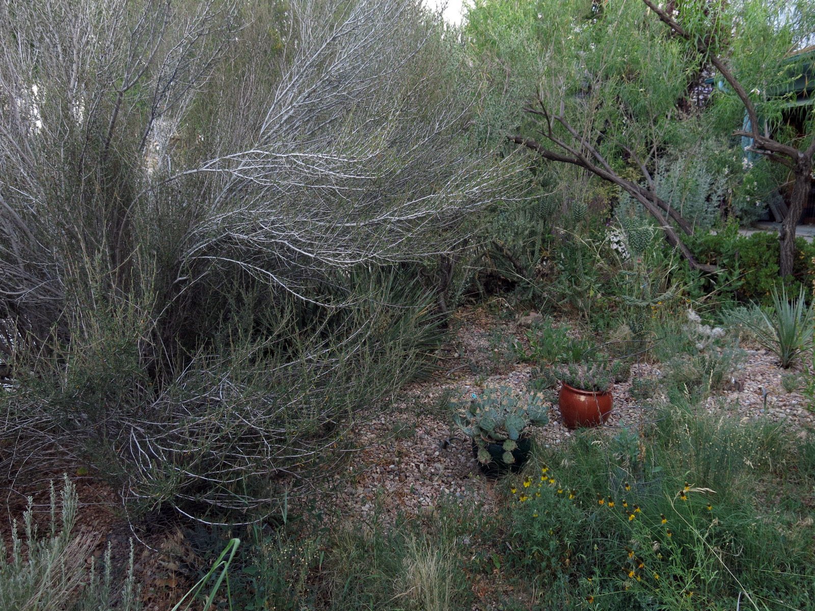 Looking back the other way, with the ultra-rangy little-leaf mountainmahogany, Cercocarpus intricatus center left. It was supposed to be pruned this spring, but the guy I live with’s imaginary gardening assistant, Tania, never showed up. She does that a lot.