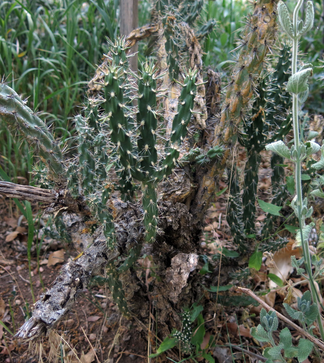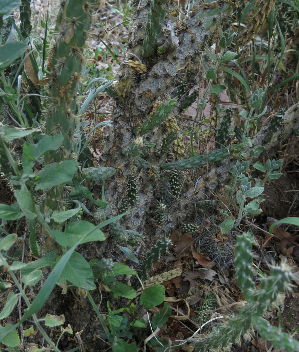 The woody trunk of the cholla, Cylindropuntia imbricata. Cactus do form woody trunks after a while. There’s some bindweed, too.